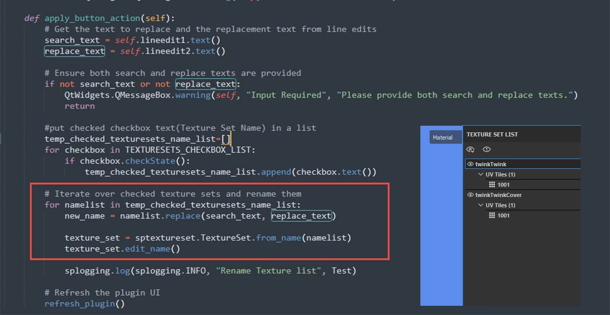 I want to edit the name of the Texture set list. I have created a UI for Search and Replace already, but I don't know the function for replacing. Please help me. Thank you.