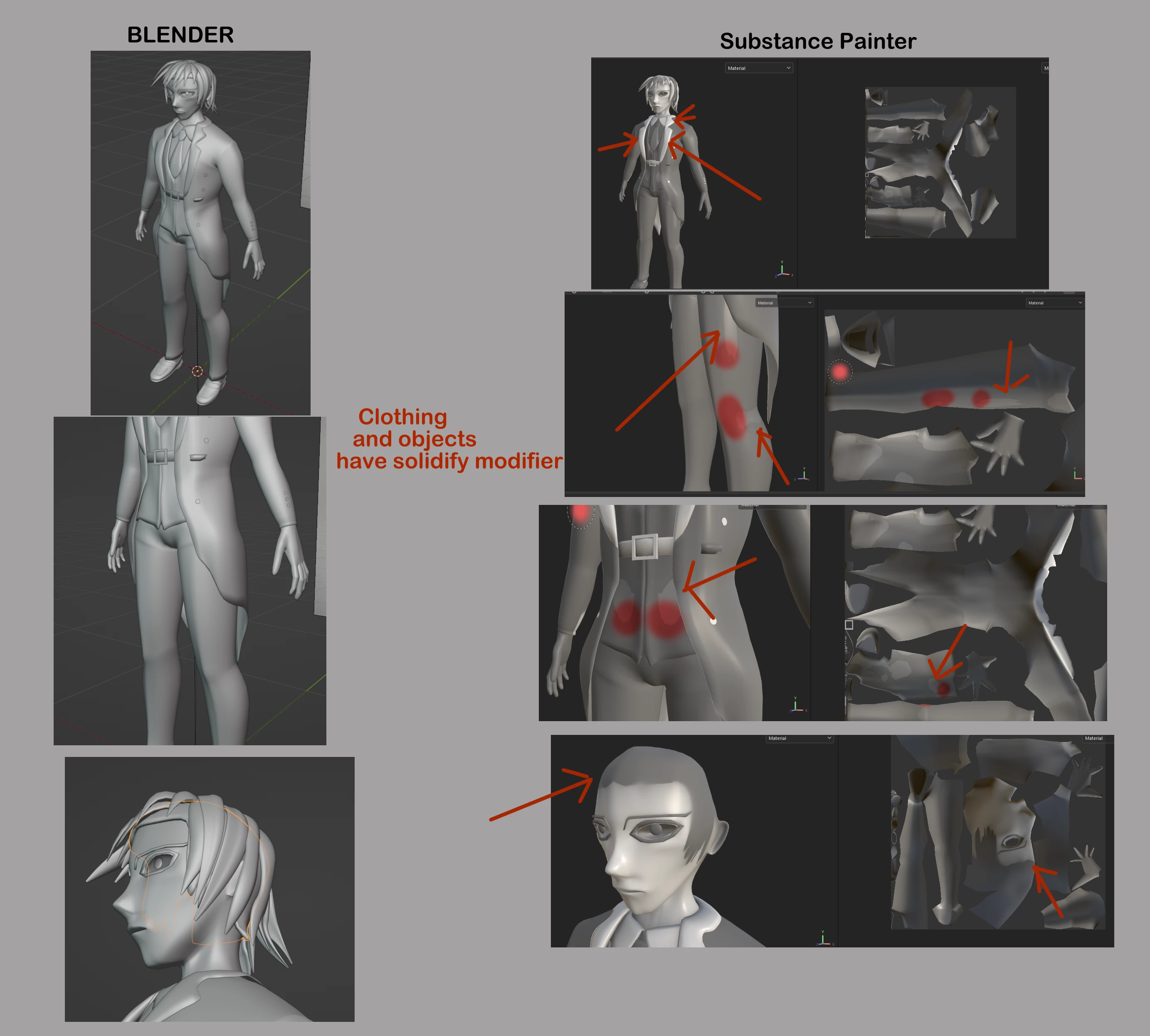 So I am baking a character who wearing an outfit but I have to ask is there something i should keep in mind when baking him like how the ambient occulsion is set. my character is clothed and has outfit over him and all. A lot of his clothes have the solify modifier and they are applied when i export it. So i bring it into painter and when i do just a quick bake to set things up, the ambient occulusion has it where his clothes has marks. I wonder if it because maybe his body under his clothes are too close to the outfit causing these issue. I also notice it made his collar white plus does it for his head. Here i'm including screenshot to see what causing this. What could I do to fix this. I could fix the body inside more but like to double check on this. Any follow up questions on this model let me know.