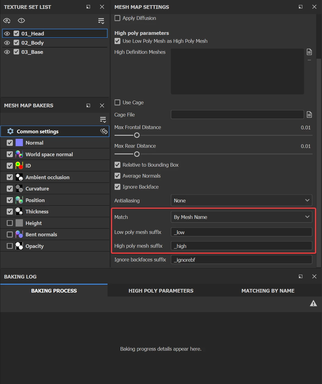 Hopefully, to bake separately certain parts of your object, we have a solution that doesn’t require to explode your mesh. The matching by mesh name option only requires a specific suffix to the geometry names and it will automatically make an exploded baking. This way, no need of having a secondary mesh, so no need to reimport mesh.