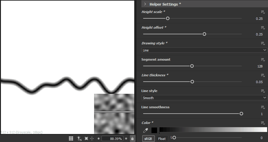 This node draws a cross-sectional profile of an input, either horizontally or vertically. That is, it provides a side view of a height map at a given row or column.