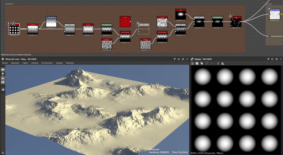 Above, the node helps create the base shape for a mountain range which can then be sculpted and included in a complex material.