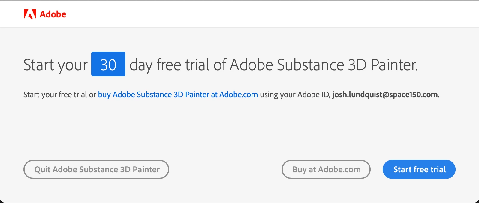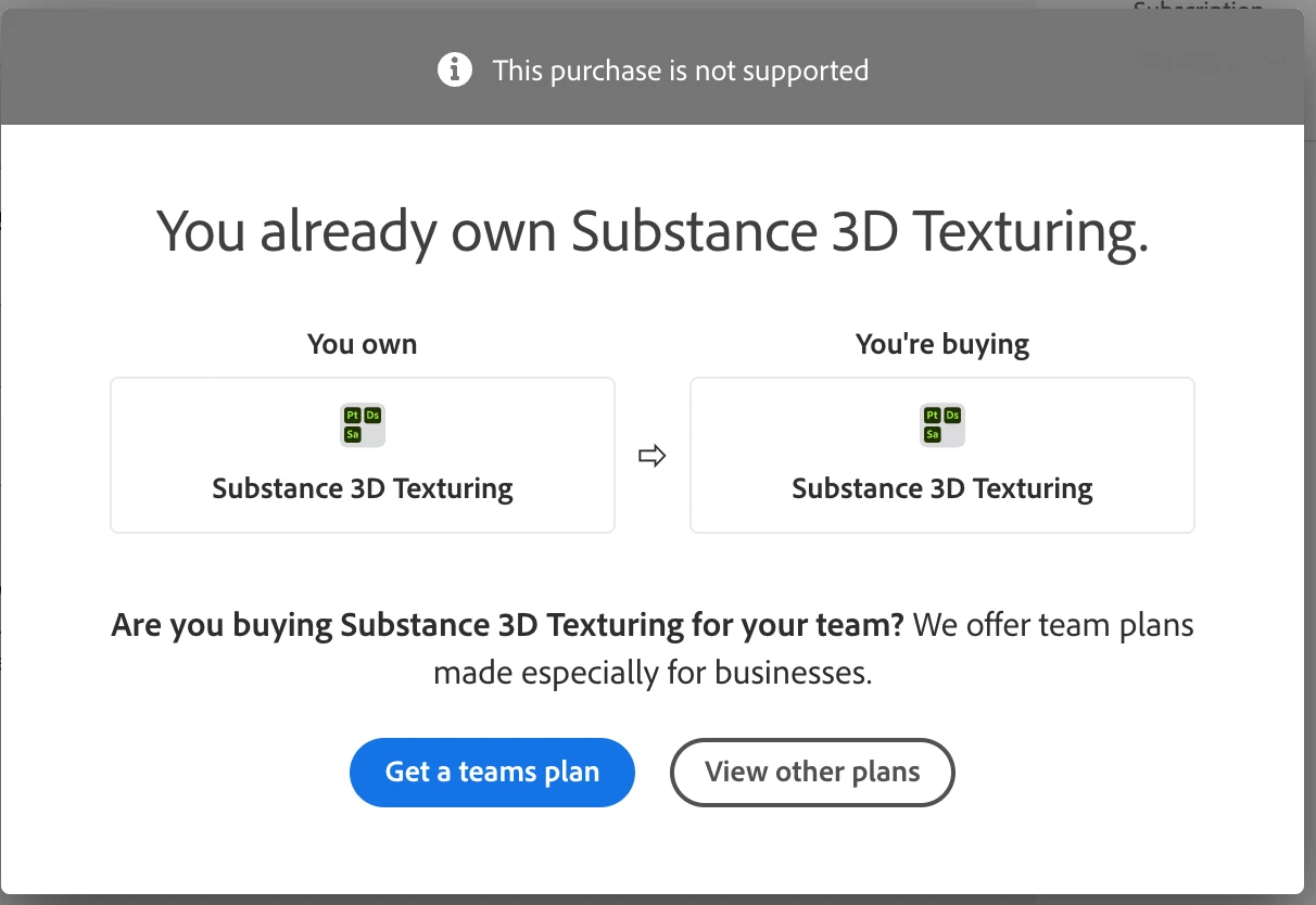 Just downloaded the new Adobe Substance Painter after buying the Substance 3D Texturing subscription, and it doesn't recognize that fact, asking me either to start a free trial or buy now. When I click "Buy Now" it sends me to the purchase page, which then states that I indeed already have purchased the subscription. Wtf is going on?