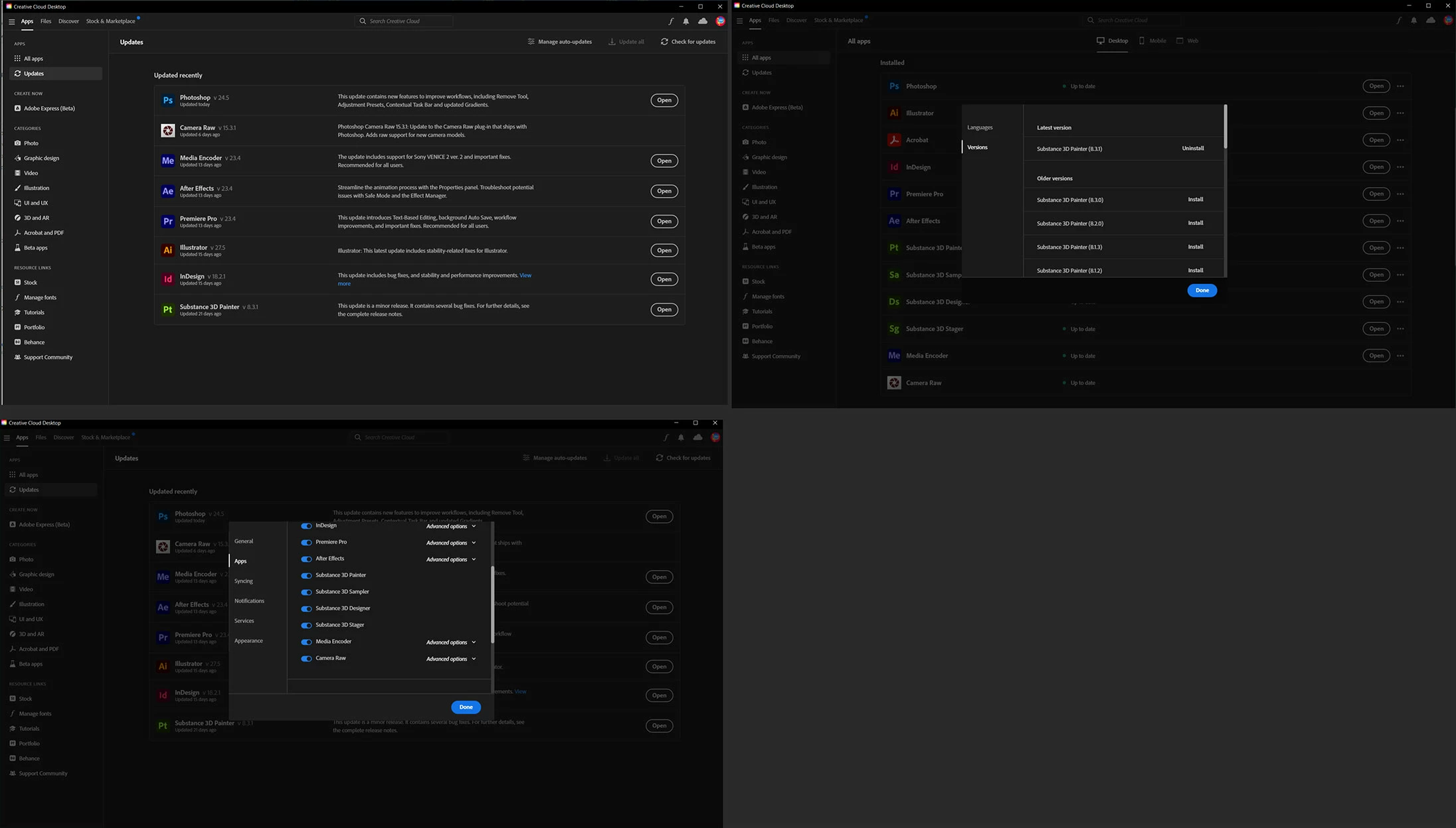 Im unable to update to version 9.0. I check the all changes link and it states that it was "Release date: 2023/06/20". I checked on the updates for Creative Cloud Desktop and it shows no new updates for Substance 3D Painter. When I checked for other verions it currently shows me 8.3.1 and older versions. I am also running into the same issue with Substance 3D designer for version 13.0. How do I go about resolving this issue?