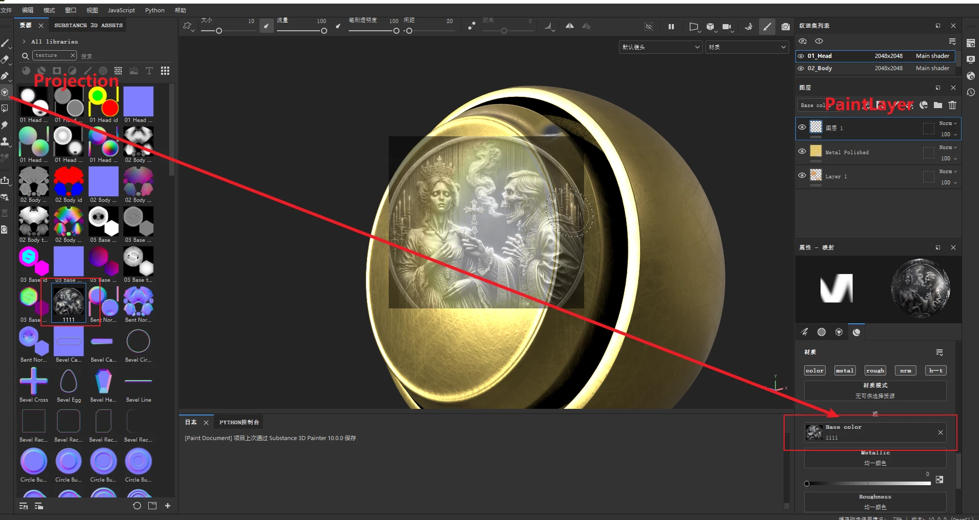 Hello, I would like to ask a question. While testing the Python API, I was unable to find the API for the Projection property in the ToolBar. I would like to use the Python API to achieve the following functionality: automatically enable the Projection feature and set the Texture for the basecolor attribute as per my specification.