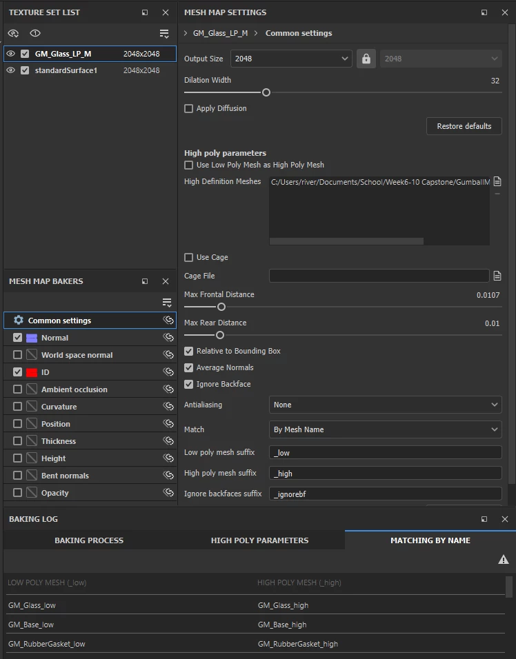 My naming format for my meshes and .fbx files are in _high/_low format. I have received no baking errors. There is a combined mesh of gumballs inside the glass mesh of the model (not yet visible until glass material is textured). I have checked my UVs and model in Maya. There are no overlapping UVs and the cleanup tool shows no issues with topology. I have three UV maps: one