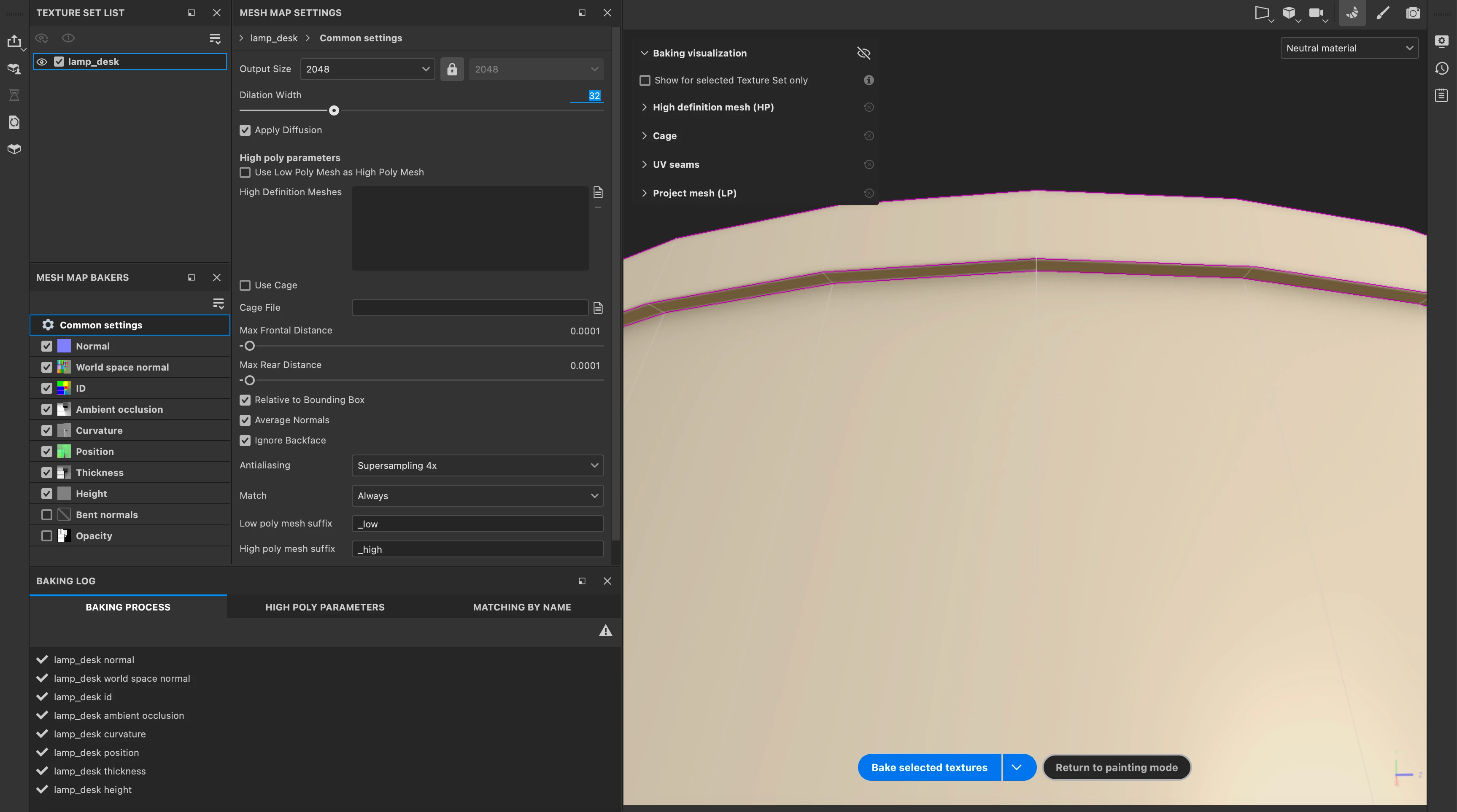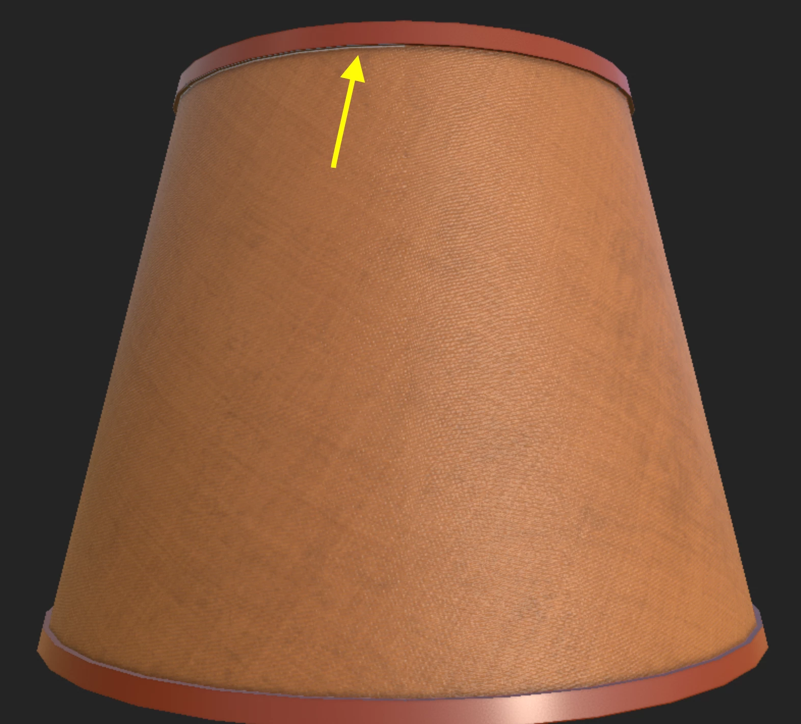 I modeled a low poly lamp in Blender and applied vertex fills to assist me in Substance. Whenever I bake my textures in Substance Painter, an edge on the lip of the lamp shade does not get textured, instead it remains white like the default mesh. My UVs in Blender do not overlap and they have been straightened with plenty of space between islands. I've tried various methods of smoothing, unsmoothing, marking/unmarking sharp edges, marking/unmarking seems on the edge where the artifact is appearing and nothing is working. I've also messed around with baking at 4k in Substance and upping the supersampling to 16x. The only thing that changes is the position of the artifact when applying some of the changes listed above, but they never get rid of it completely as far as I can tell. Below are images of the artifact and my UV layout in Blender.