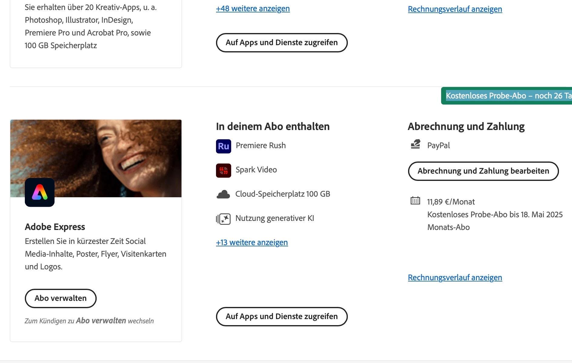 Nun ist es jedoch so, dass mir zwar im Hauptmenü "Kostenloses Probeabo noch 26 Tage" angezeigt wird, ich jedoch keine Apps starten kann bzw dann immer direkt einen neuen Zahlungsplan anlegen muss, der dann aber beispielsweise als Testversion nur 7 Tage anzeigt.