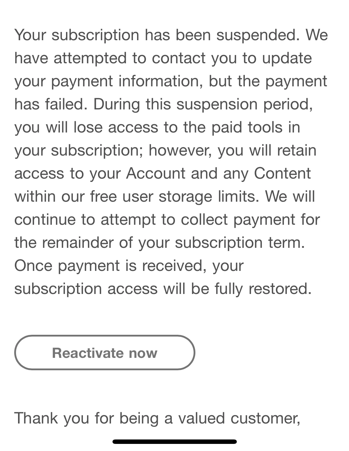 Hello I requested my account not renew, but I received an email that my account has been suspended for non payment. When i check in my account it says i cancelled my plan.