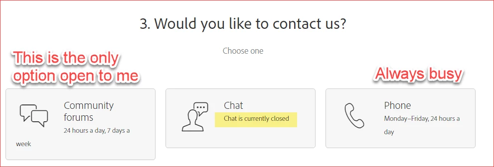 When I try to contact Adobe support, there is no help. The Chat is 'currently closed' and the phone line rings busy all the time.
