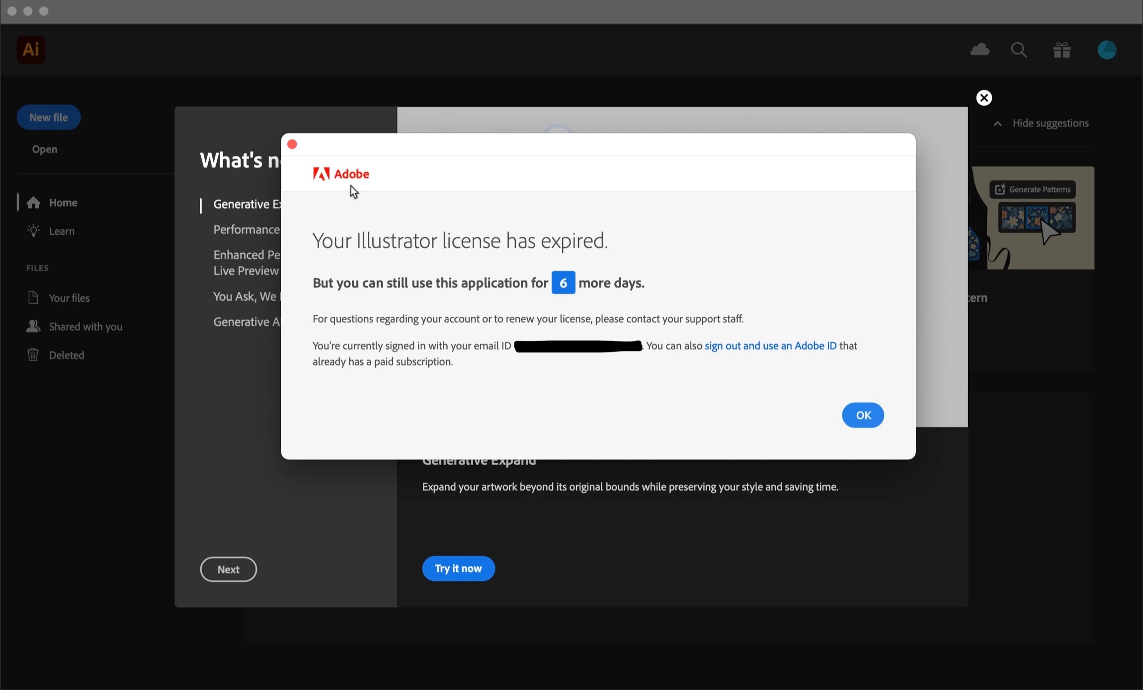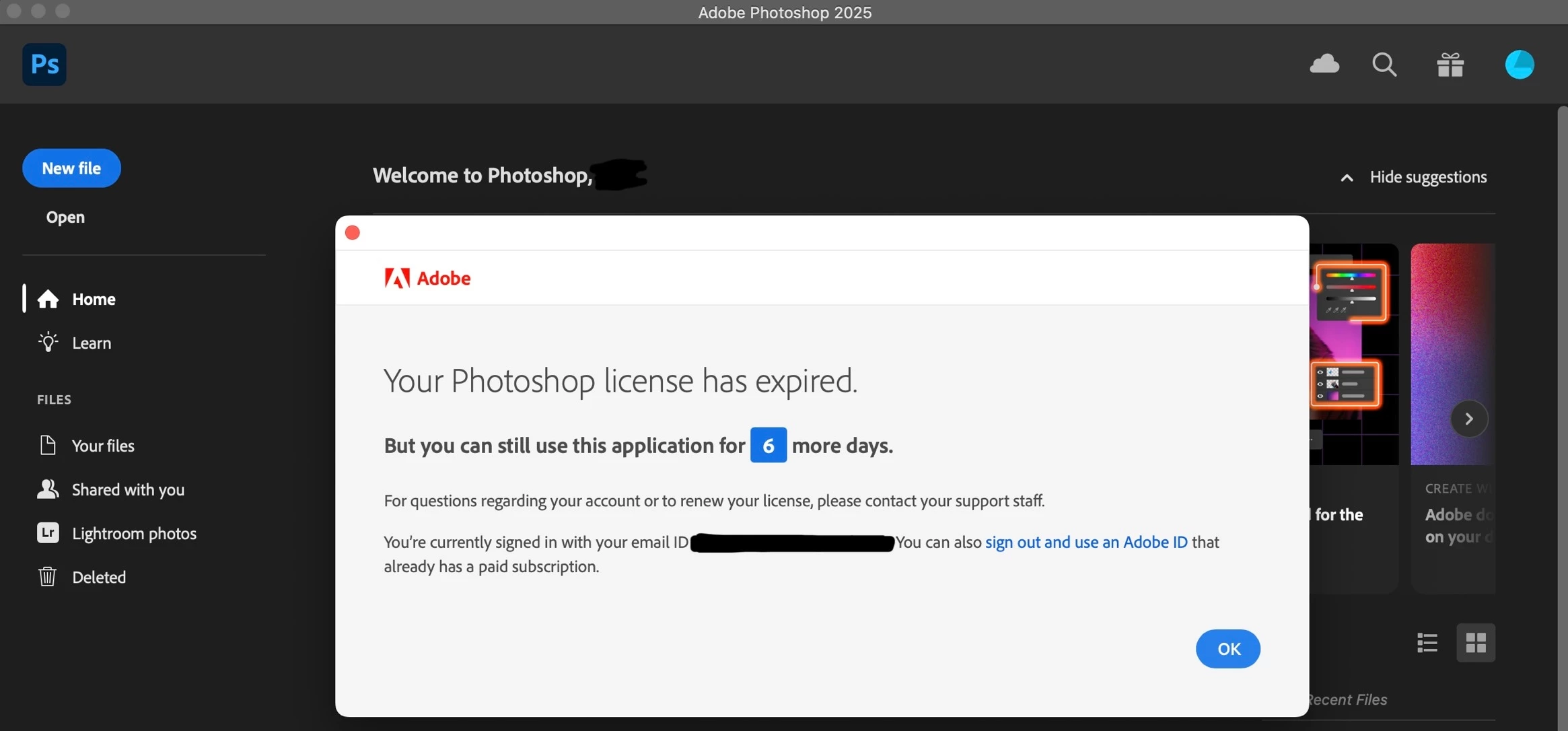 Unlike my expectation, when I open Photoshop, Illustator, or any other Adobe CC apps, a pop-up began to show up saying, "Your Photoshop license has expired, but you can still use this application for 6 more days." In a panic, I tried to solve the problem by signing out and logging back in, uninstalling apps and Adobe CC and reinstalling them, and restarting my computer while troubleshooting, which none of them were working. I am using my Adobe CC from two different computers; one is MacBook Air and the other is Windows. I have checked my account from Windows by signing out of my Adobe CC and logging back in and opening several different apps (Photoshop, Illustrator, InDesign, etc.), which the pop-up didn't show up but worked just fine.