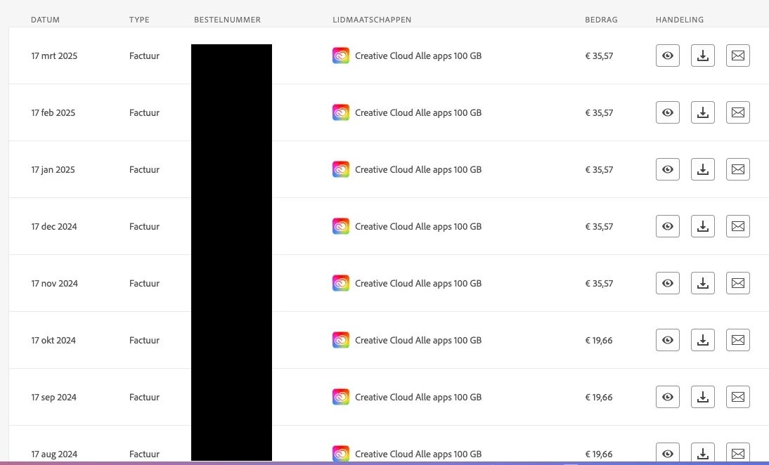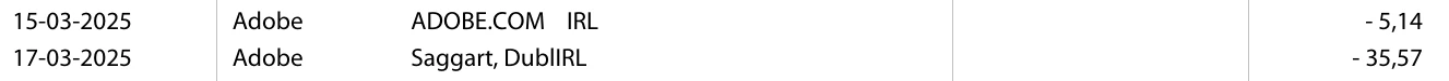 I recently found out that Adobe has been charging me an extra €5,14 on top of the monthly subscription I have been paying "Creative cloud all apps 100 GB". This has been ongoing since July 2023. Every month they charge me 2 charges as in screenshot:
