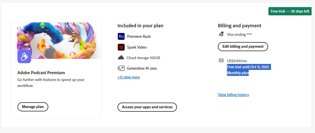 Adobe Podcast free trial but still charged me 1 month fee