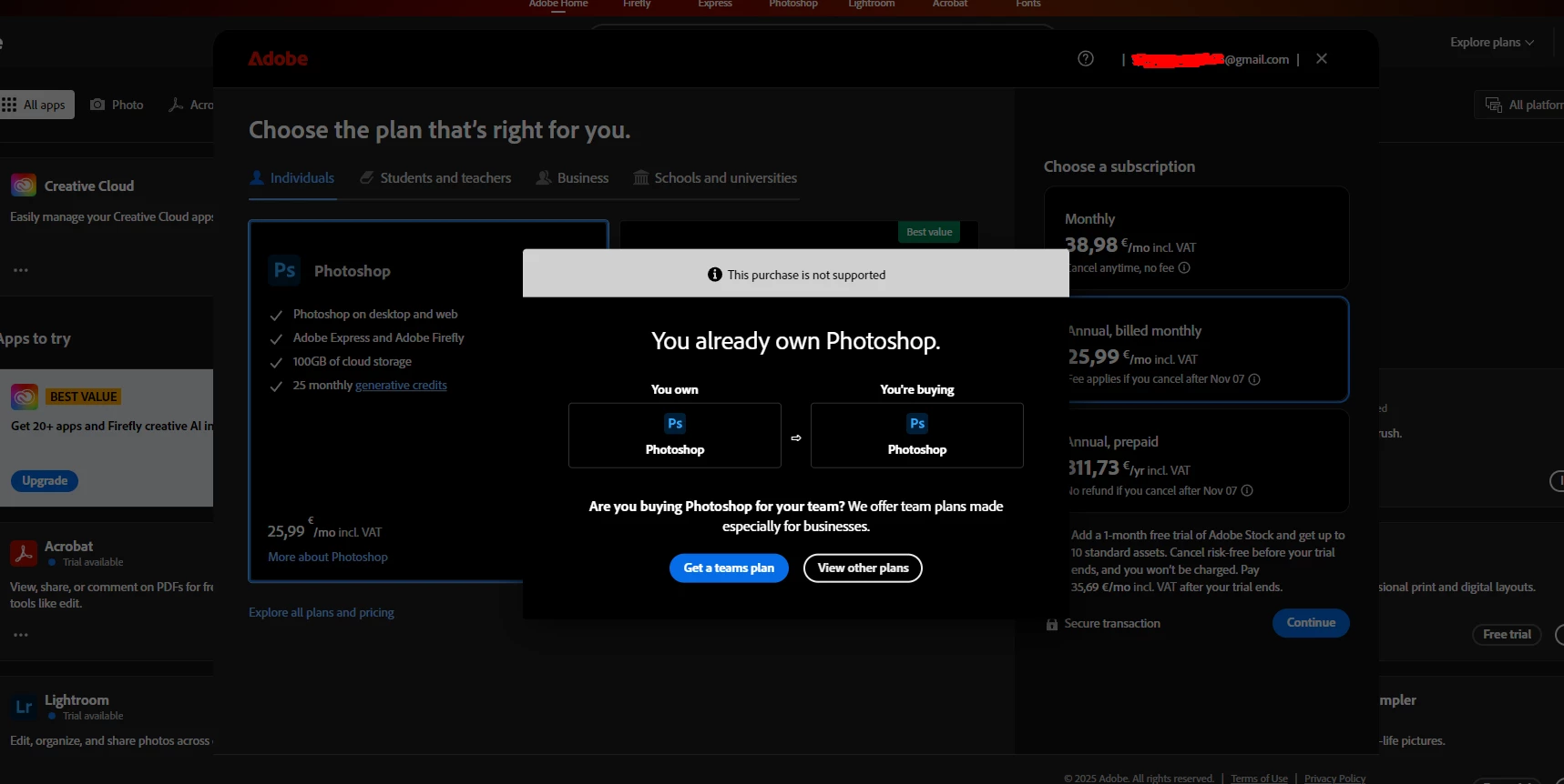 Then it doesnt give me any other options besides buying Photoshop for a Team / switching to Teams Plan.