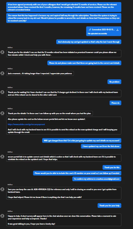 I have been promised a 12 month refund as you can see below, 3 of the months came through. 9 of them didn't as I had updated my card details recently, therefore, the system sent the 3 months to my new card and 9 months to my old (expired) card. This has also been confirmed by my bank. It has been over a month and they still refuse to give me back the 9months I have been owed. I also tried contacting them through the chat section and agents have been leaving the conversation rather than helping me. Any one got any advice?