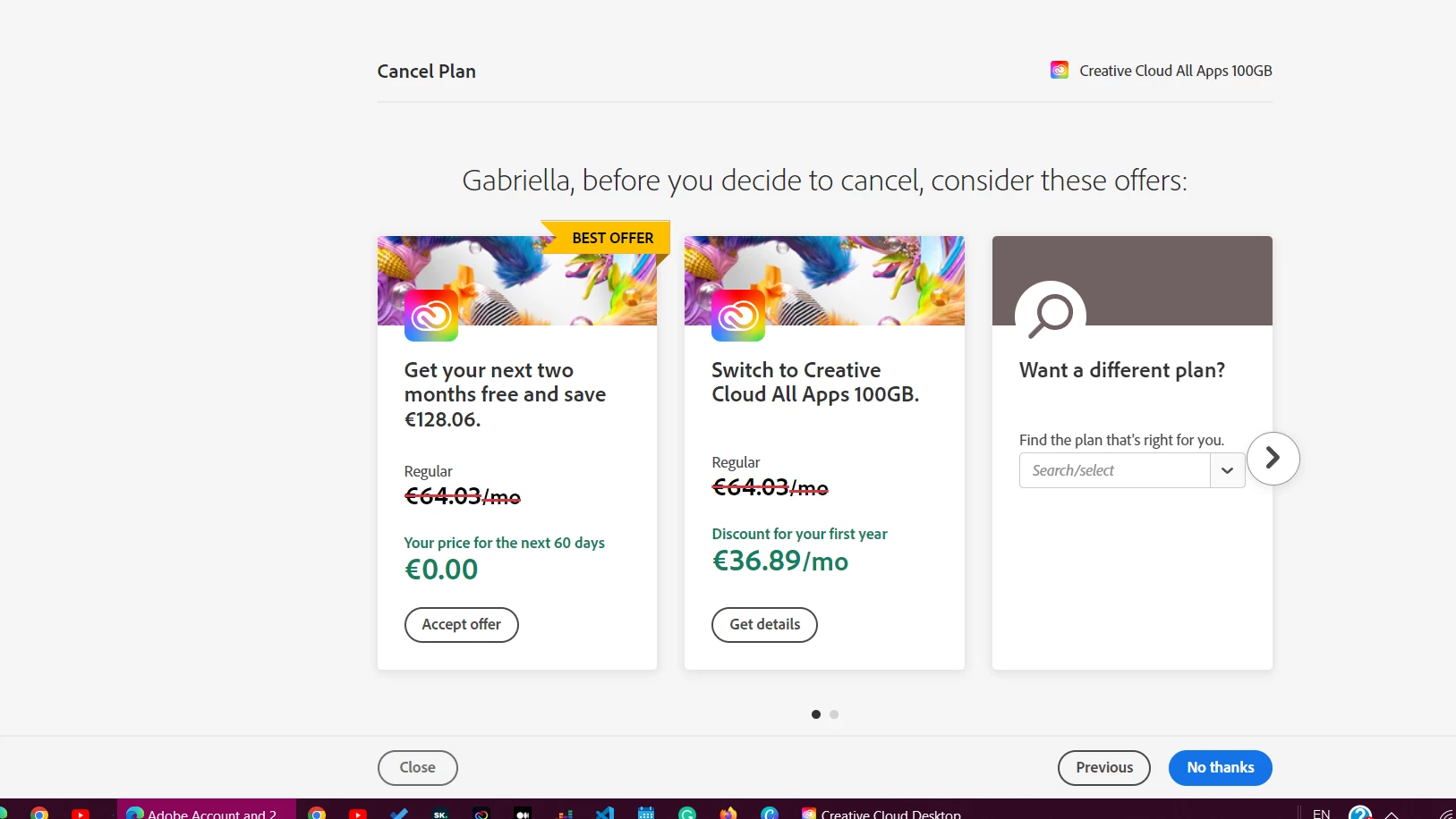 My one year adobe cc is almost done in 2 weeks and I wanted to cancel it earlier. When input a reason, I ticked too expensive after which I proceed to my cancellation. Then I came to the section in which they offered a discounted one-year subscription.