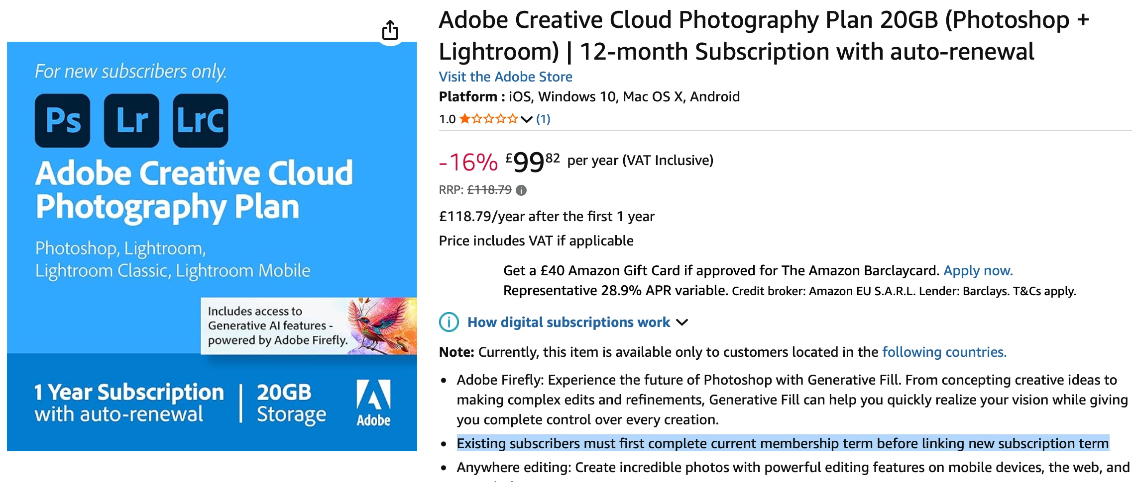 I thought that the Creative Cloud 20gb plan had been withdrawn for new subscribers? However Amazon appear to be selling 12 month subscriptions for arounf £100 here in the UK. It states they are only for new subscribers, but then says existing subscribers must first complete current membership term before linking new subscription term. Are these fake? It doesn't seem worth the hassle for the cost saving.