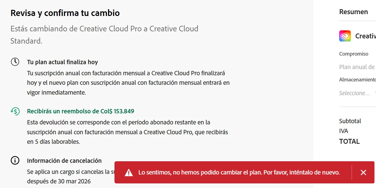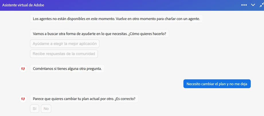 Alguien que me ayude, todo el día he intentado realizar cambio de plan por la administración de productos, veo malas intenciones por tratarse de un cambio más económico y sale error del sistema, no responden por chat.