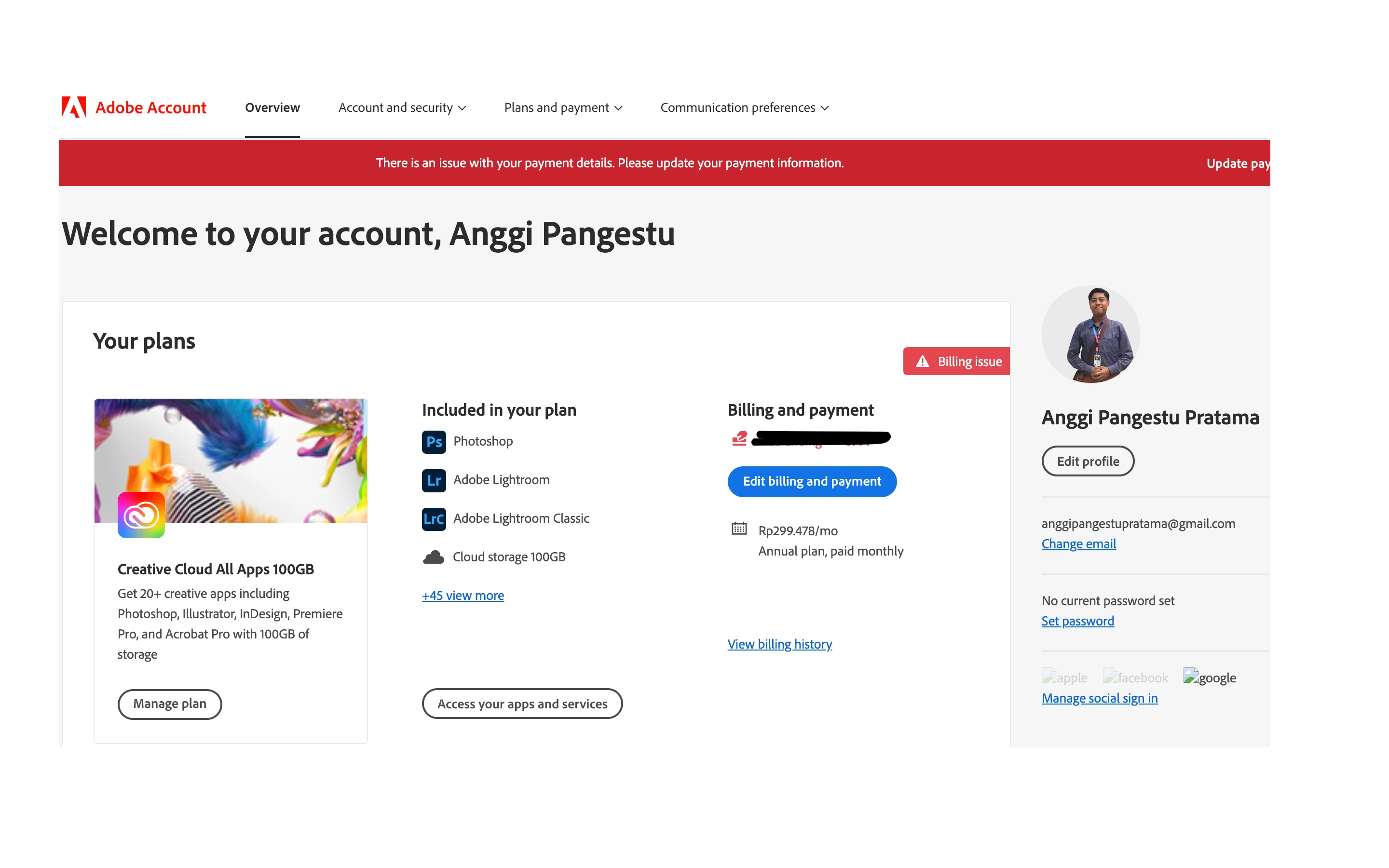 I just got a "Warning Sign" on my Creative Cloud App and once I sign in to my Adobe Account via browser, it said I have a Billing Issue. I try to fix it by Updating Payment, but "Something Wrong" pops up. I can not view the Update Payment window so I do not know what is wrong with it? I already check my Visa Account and nothing happen there. Can someone please explain about this issue?