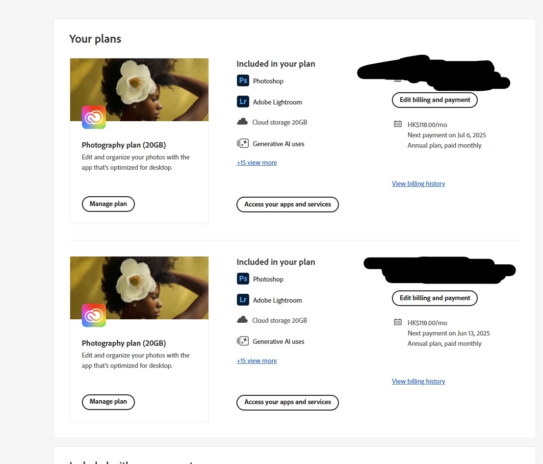 I hope this email finds you well. I recently noticed that my Adobe account has been charged twice for the Photography Plan subscription. It appears that there is an issue where my account has two active plans, resulting in duplicate billing.