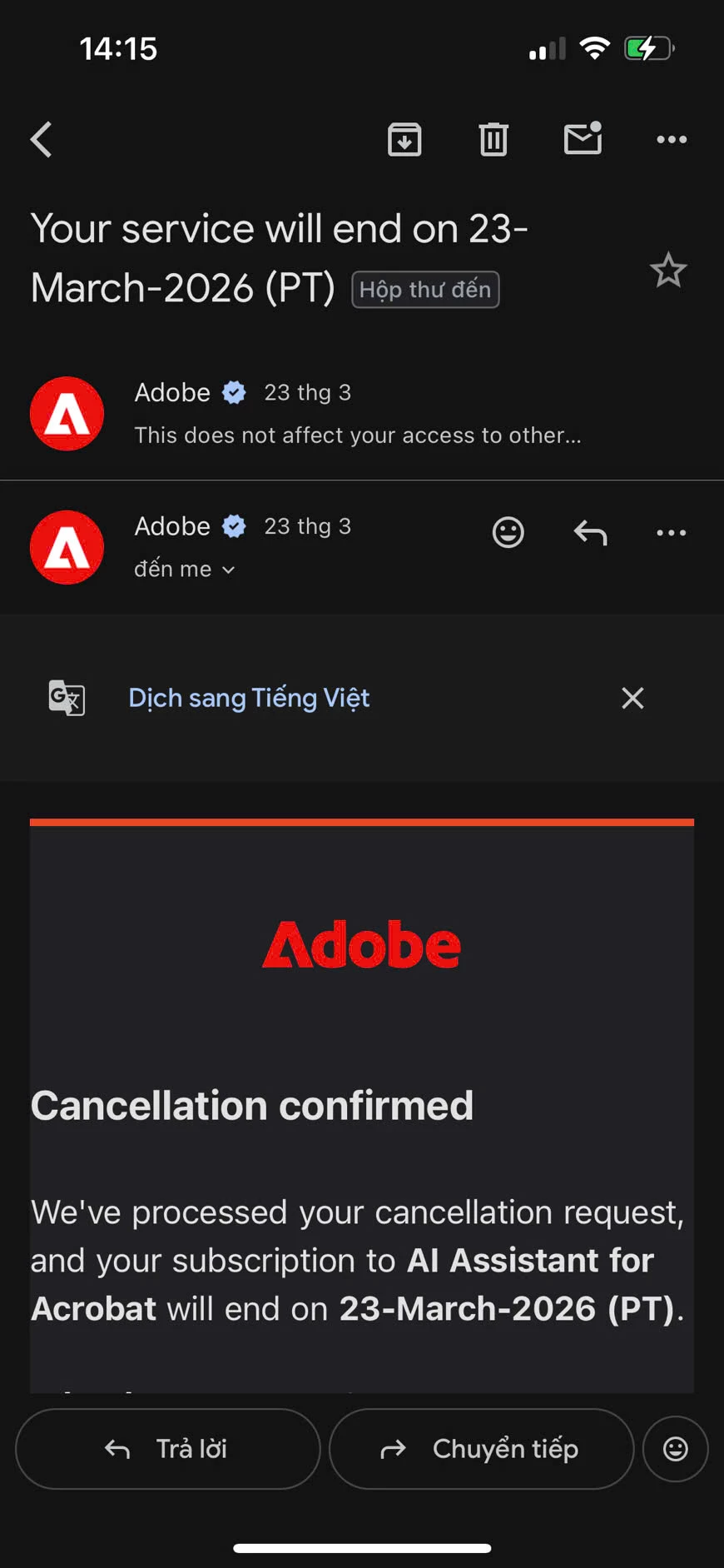 Below is the screenshots of today (24th March) notice of failed billing and the 23rd cancelling confirm email
