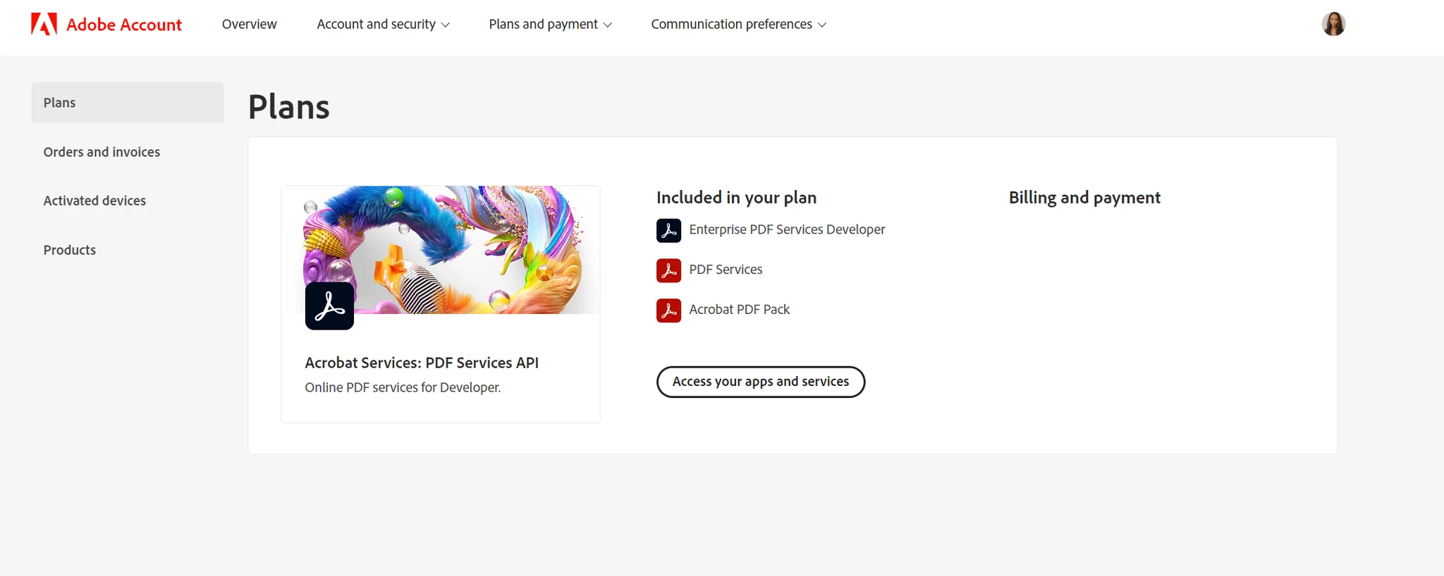 I noticed a month before my Adobe subscription ran its course, that I was unable to see anything under the 'Billing and payment' section of my Account. (See image.) Usually you would be able to see a button to 'Edit billing and payment' and a link to 'View billing history'.