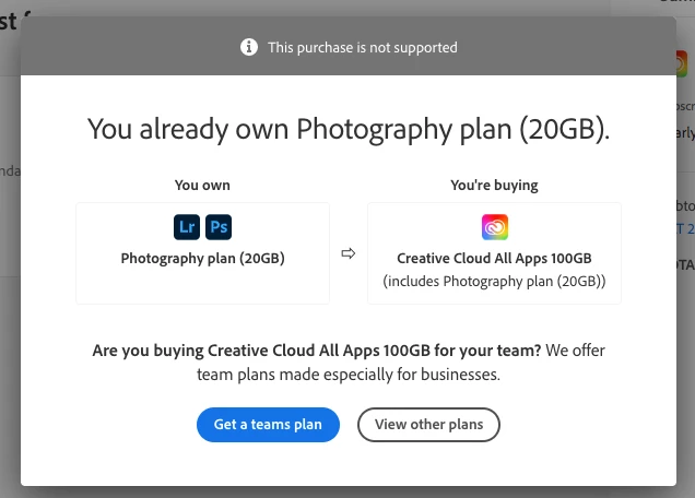 Hi, I currently have the student photography plan and I am trying to upgrade to the student Creative Cloud All Apps so I can get Illustrator. However, it brings up the attached screen every time, trying to make me buy teams plans which I do not want to do.