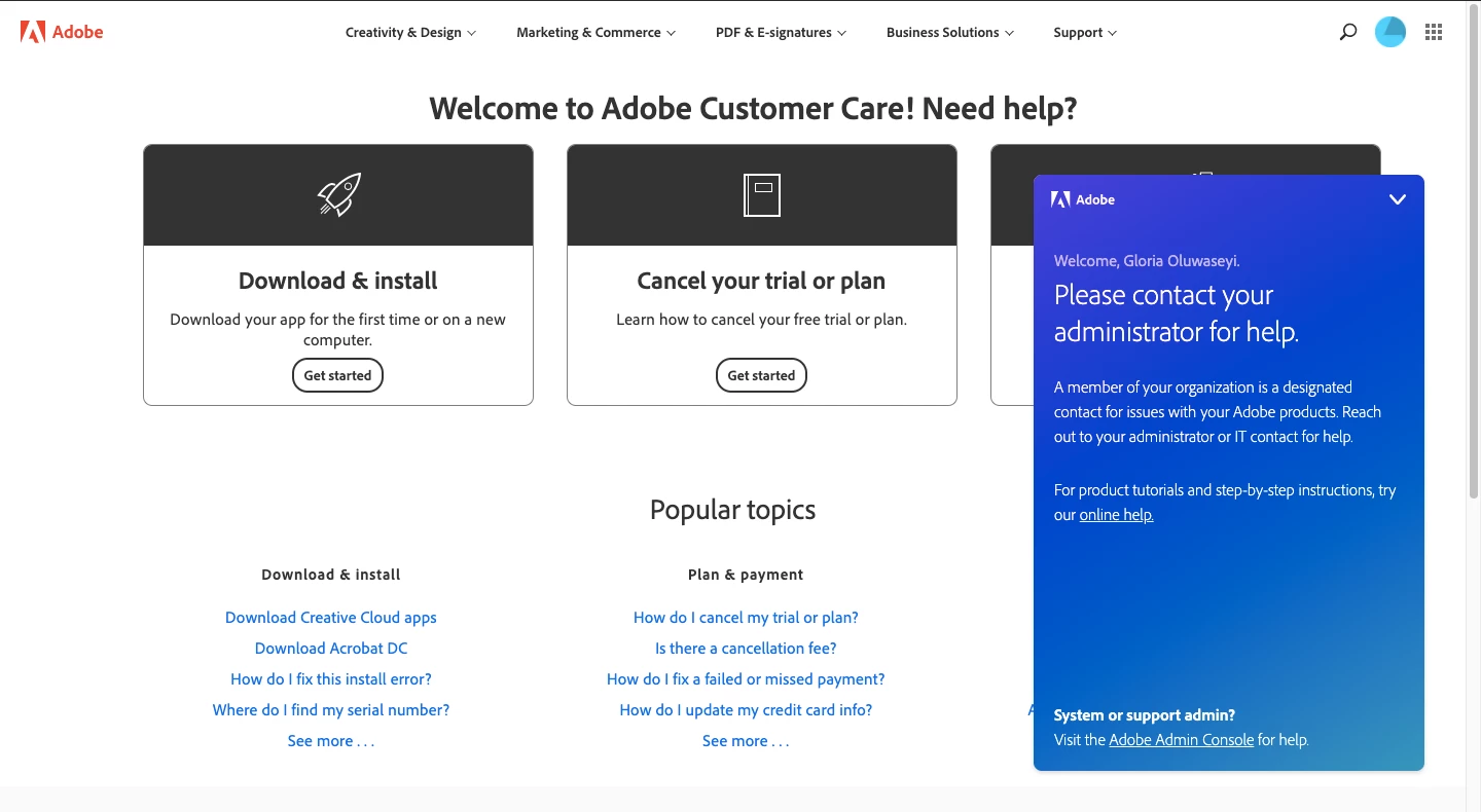 I can't seem to contact any Adobe responsible directly which is VERY frustrating: when I click on the 'contact' or 'help' buttons I get a window saying I should 'contact my IT administrator'. If the plan is not going to work then I WANT MY MONEY back.