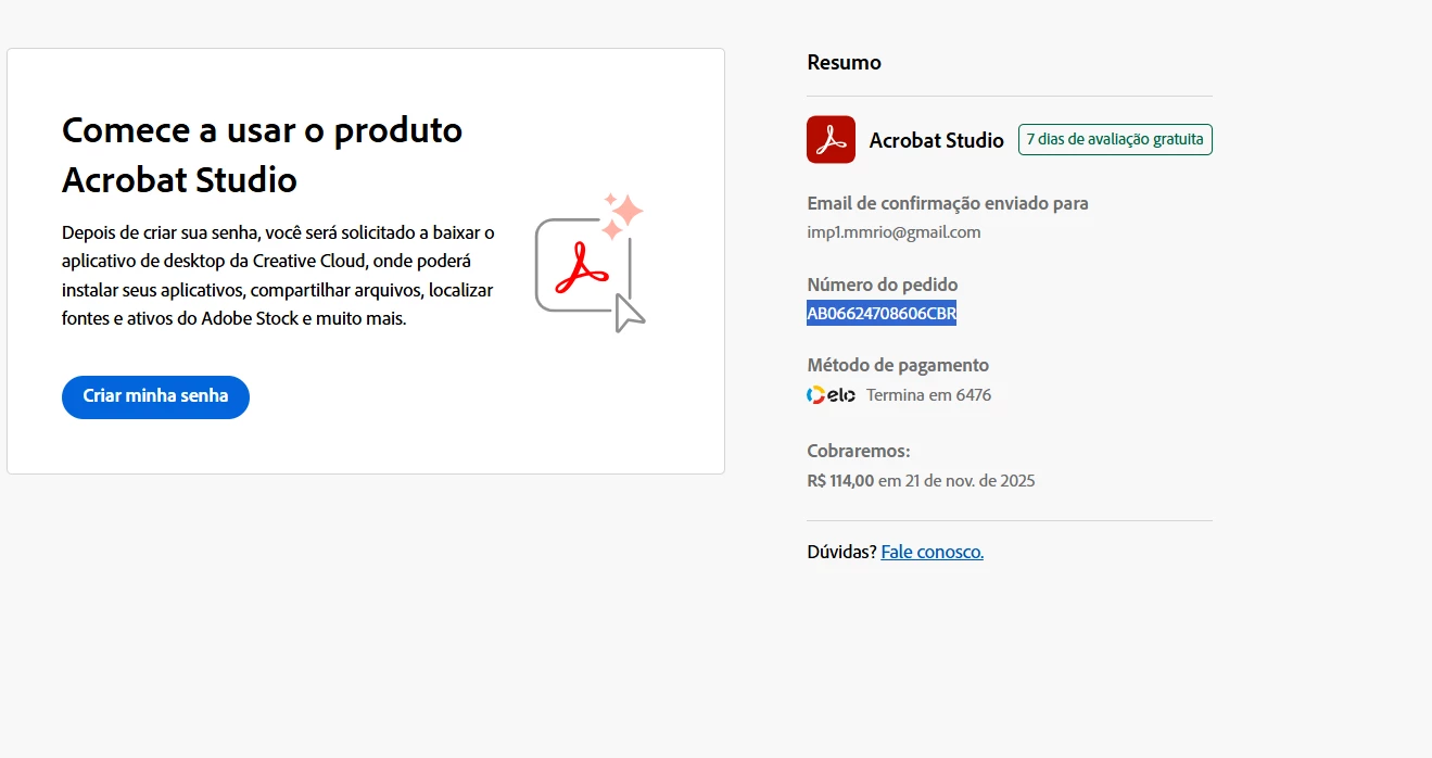 Gostaria de auxilio para cancelar a assinatura feita na data de hoje 13/11, pois utilizei o email para cadastro errado, e o cartão estava salvo na minha máquina já. Agorra preciso do cancelamento urgente para que nao seja feita a cobrança. Como proceder, ja que utilizei o email errado para cadastro e nao consigo acessar a area de planos para cancelamento? A imagem a da efetivação do pedido com o email errado: