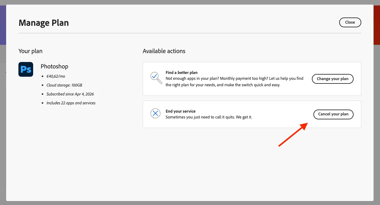 I paid for a monthly subscription to the Photoshop Plan. Same day and few hours later, I realized I don’t actually need this plan so I visited this page in order to cancel.