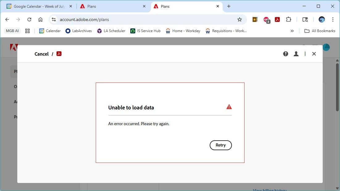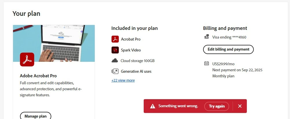 @ 9/21/2025 7:00 PM EST, the page for "Edit Billing and Payment" is unreachable and the page for "Cancel your plan" is unreachable. I signed up for a Free Trial in July 2025, but when I tried to cancel during the trial period the page was "Unable to load data." I cancelled the credit card, and Adobe can eat sand.