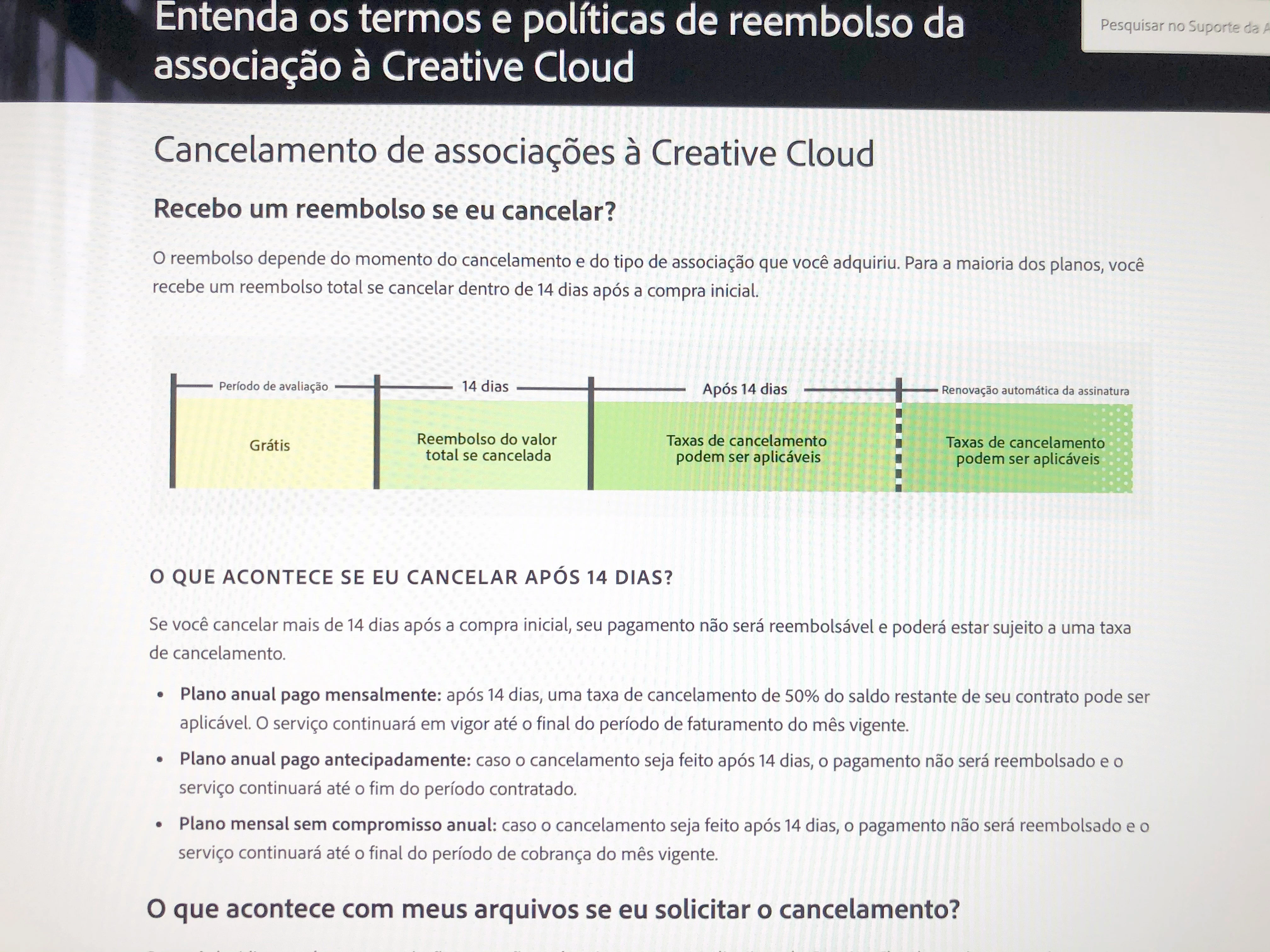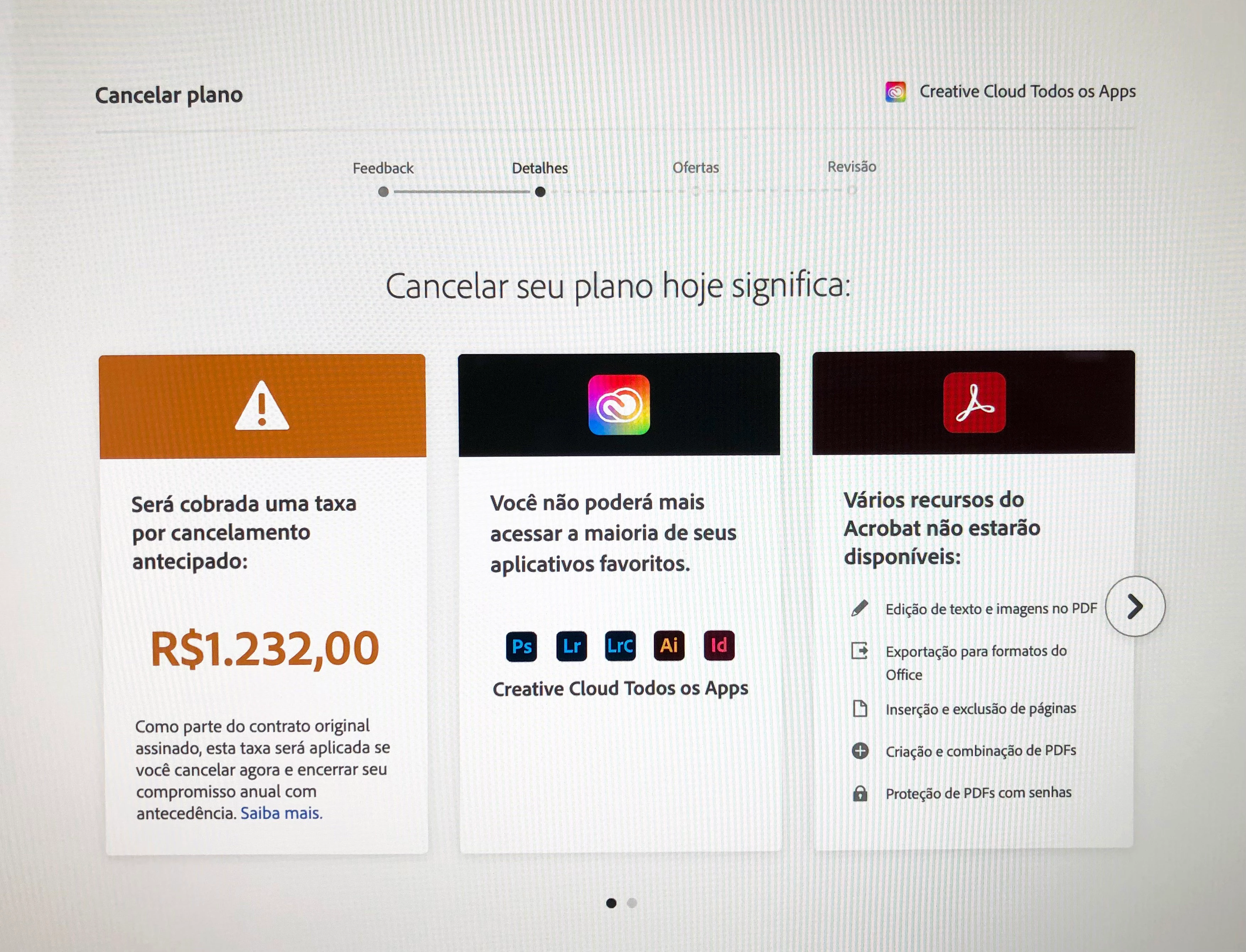 Boa tarde, Minha assinatura foi renovada automaticamente em 16/02/2021. Nessa data tentei cancelar, pois com a pandemia estou quase sem trabalho e o valor passou de R $ 124,00 (mensal) para R $ 224,00 (mensal). Um aumento de 80% que nesse momento não tenho a menor condição de assumir. Ao tentar cancelar aparece a informação que terei que pagar R $ 1.232,00 (50%) e ainda por cima, pelo que li, a Adobe debita esse valor de R $ 1.232,00 e nem dá direito ao período que seria correspondente. É isso mesmo ??? As informações não são claras !!!! Estou dentro dos 14 dias, hoje é 26.02.2021, mas não sei se consideram esse prazo na renovação automática.Também não consigo tirar o cartão de crédito cadastrado. Tenho receio de debitarem automaticamente o valor de R $ 1.232,00 que não posso pagar. O Chat, que é a forma de contato disponibilizado pela Adobe não responde a nada disso. CONSIDERO UM ABUSO E ESTOU PROFUNDAMENTE DECEPCIONADA! Não quero nada gratuito, apenas o direito de desistir dentro do prazo, de forma justa !!! Podem me responder, por favor, antes que passe o prazo dos 14 dias? Obrigada.