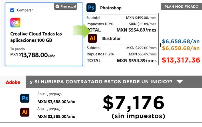 Al final en ese plan solo usé más Photoshop e Illustrator. Ahora, modificar el plan a esas 2 apps me sale casi el mismo precio como si renovara mi plan actual. Sin embargo, cheque en el sitio de Adobe que contratar Photoshop e Illustrator me sale casi la mitad de mi plan actual o incluso si lo modificara.