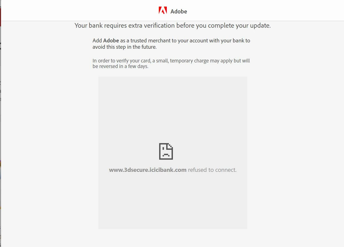 I'm unable to purchase creative cloud subscription. I'm entering correct payment details. When I click the submit button, it shows a pop up and asks me to type OTP to confirm payment. After I do that, I get the following error