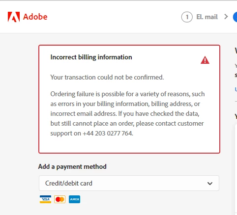 i try another card - nothing. All my cards working fine, also i use my cards for Amazon and google and all works fine. Is any restrictions to buy subscription? i try to buy in my region and in US region on Adobe site - same problem. Nothing helps. Try to use vpn or different PC - same problem. You need pass some exams to buy it ;)?
