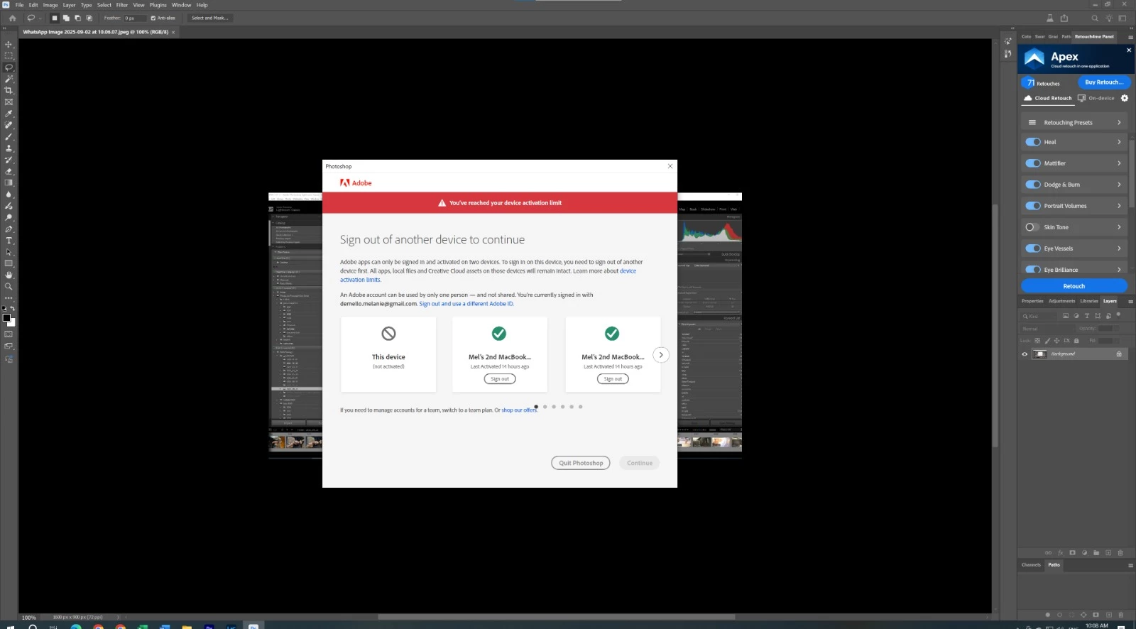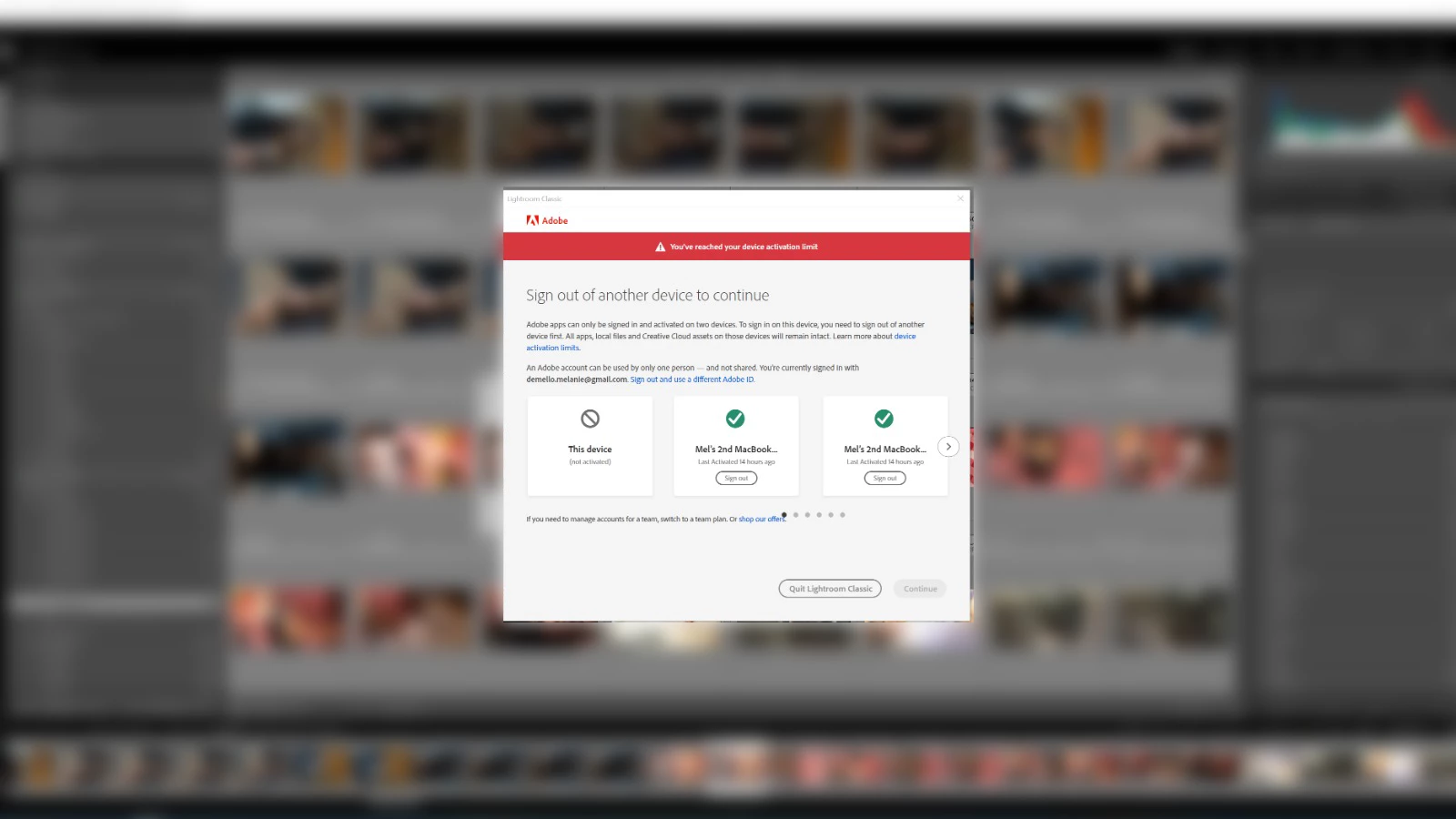 YOU HAVE A CRITICAL FLAW WITH YOUR PAID MEMBERSHIPS AT THE MOMENT! YOU HAVE A NEW WINDOW THAT SHOWS UP FOR ME EVERYTIME I OPEN A NEW PROGRAM SAYING I CAN BE SIGNED IN AND ACTIVATE TWO DEVICES. I HAVE ONLY 2 DEVICES MY MACBOOK LAP AND MY PC. WHEN I SAY SIGN OUT OF MY MACBOOK (IT SHOWS THE SAME DEVICE OPEN SEVERAL TIMES) IT JUST CLOSES THE PROGRAM AND MAKES ME START ALL OVER. THIS IS RUINING MY MOMENTUM, RUINING MY FLOW AND WASTING MY TIME!!!!!!!