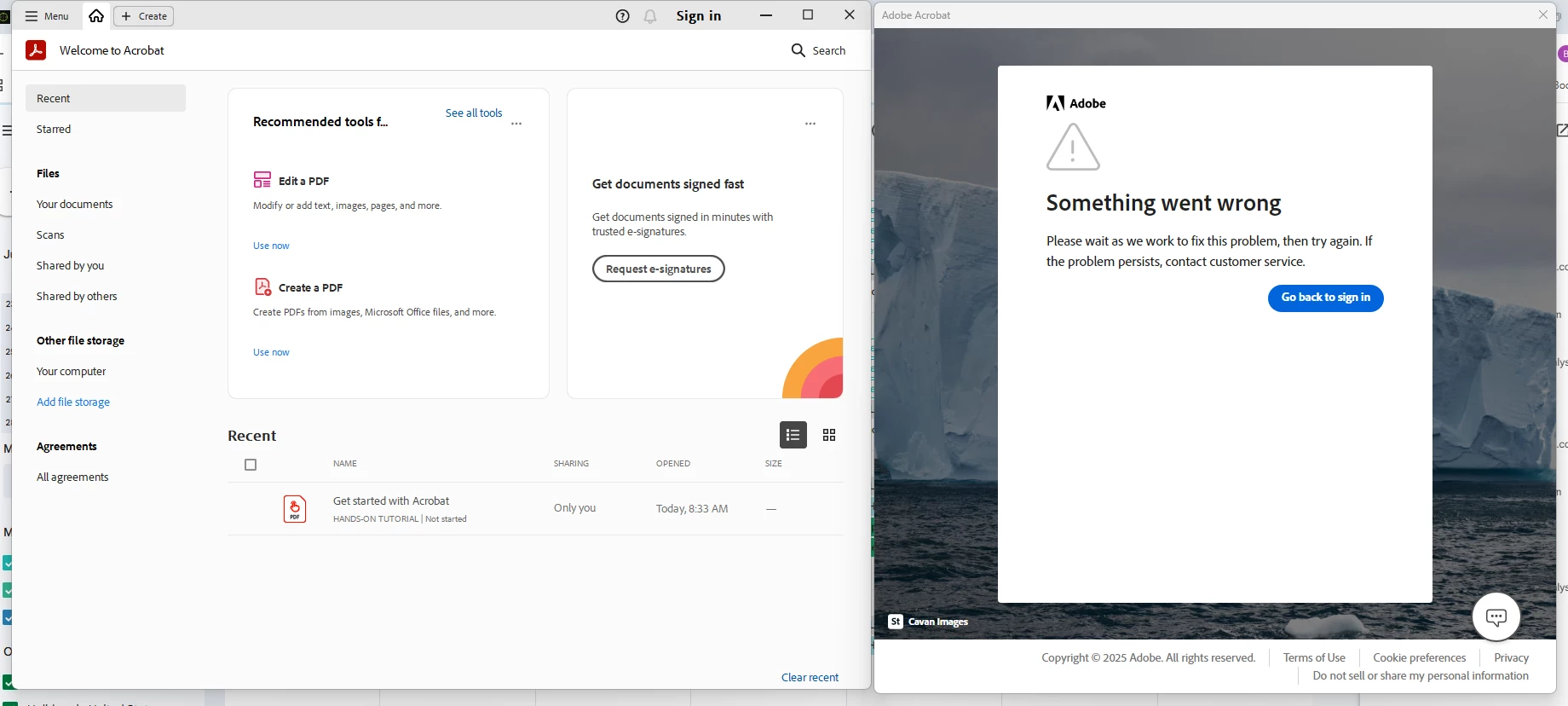 I get this far into my adobe accoutnt and this is the error I am getting can someone help me with this please.