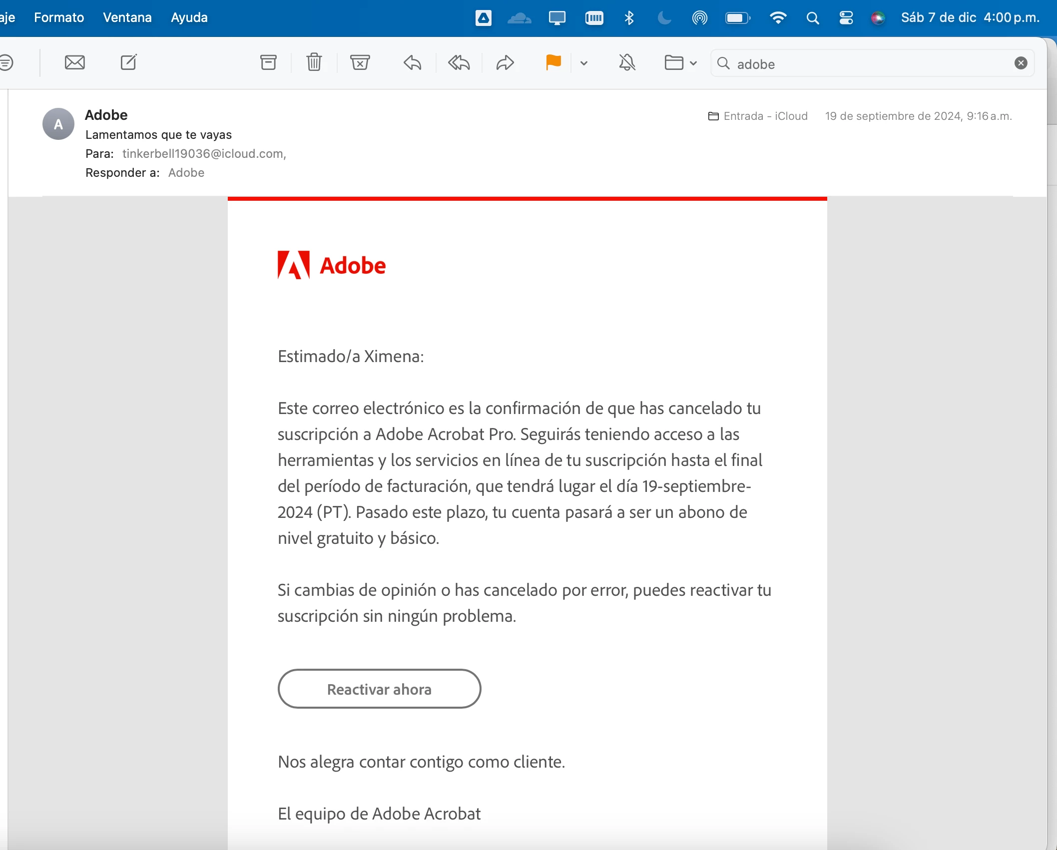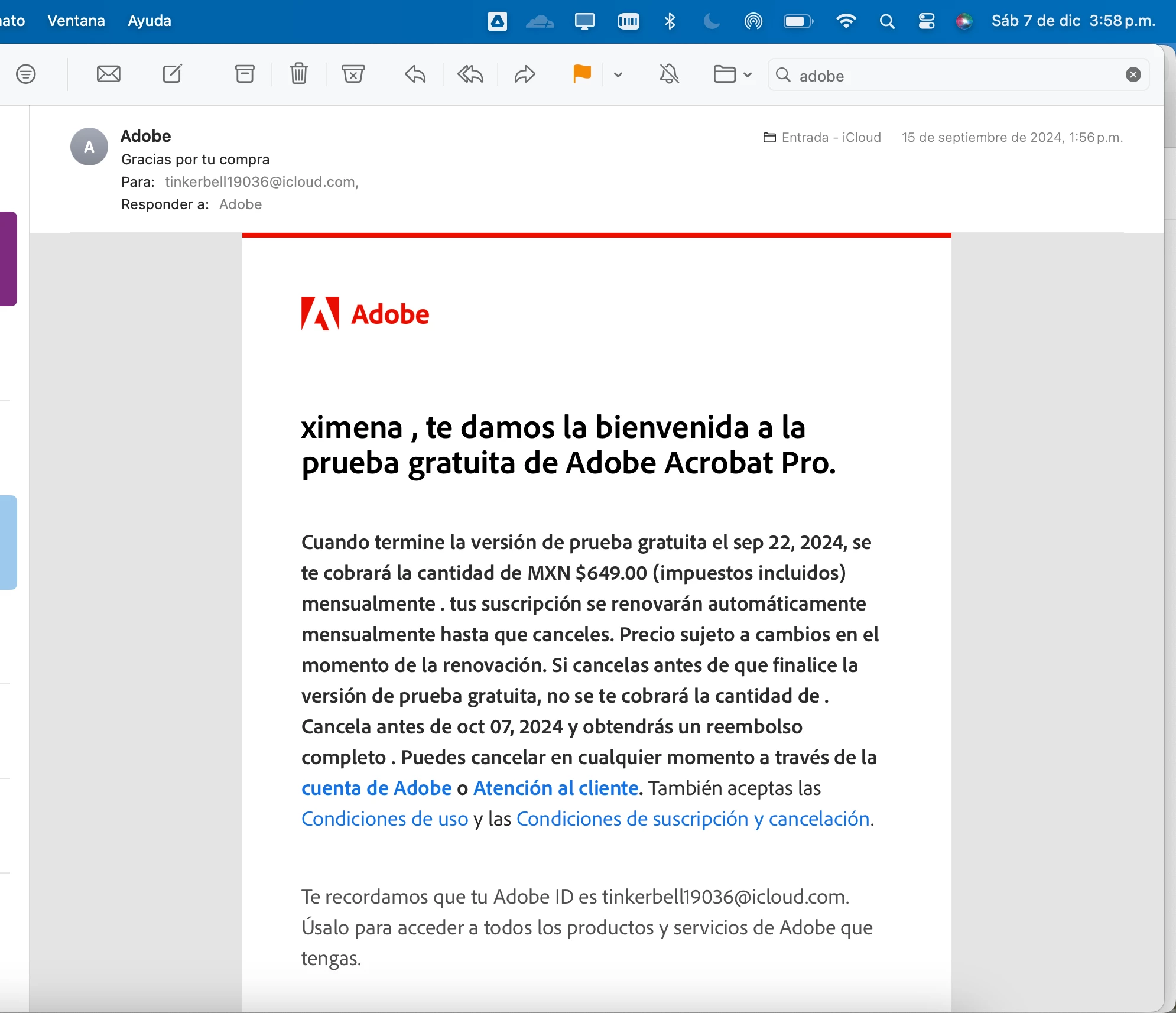 Realicé una suscripción a Adobe Acrobat Pro el día 15 de septiembre de 2024 y cancelé el plan el 19 de septiembre de 2024. Incluso recibí el correo de confirmación de cancelación. Según la información proporcionada, mencionaron que podía cancelar SIN COSTO y SIN COBRO dentro de los primeros 14 días.