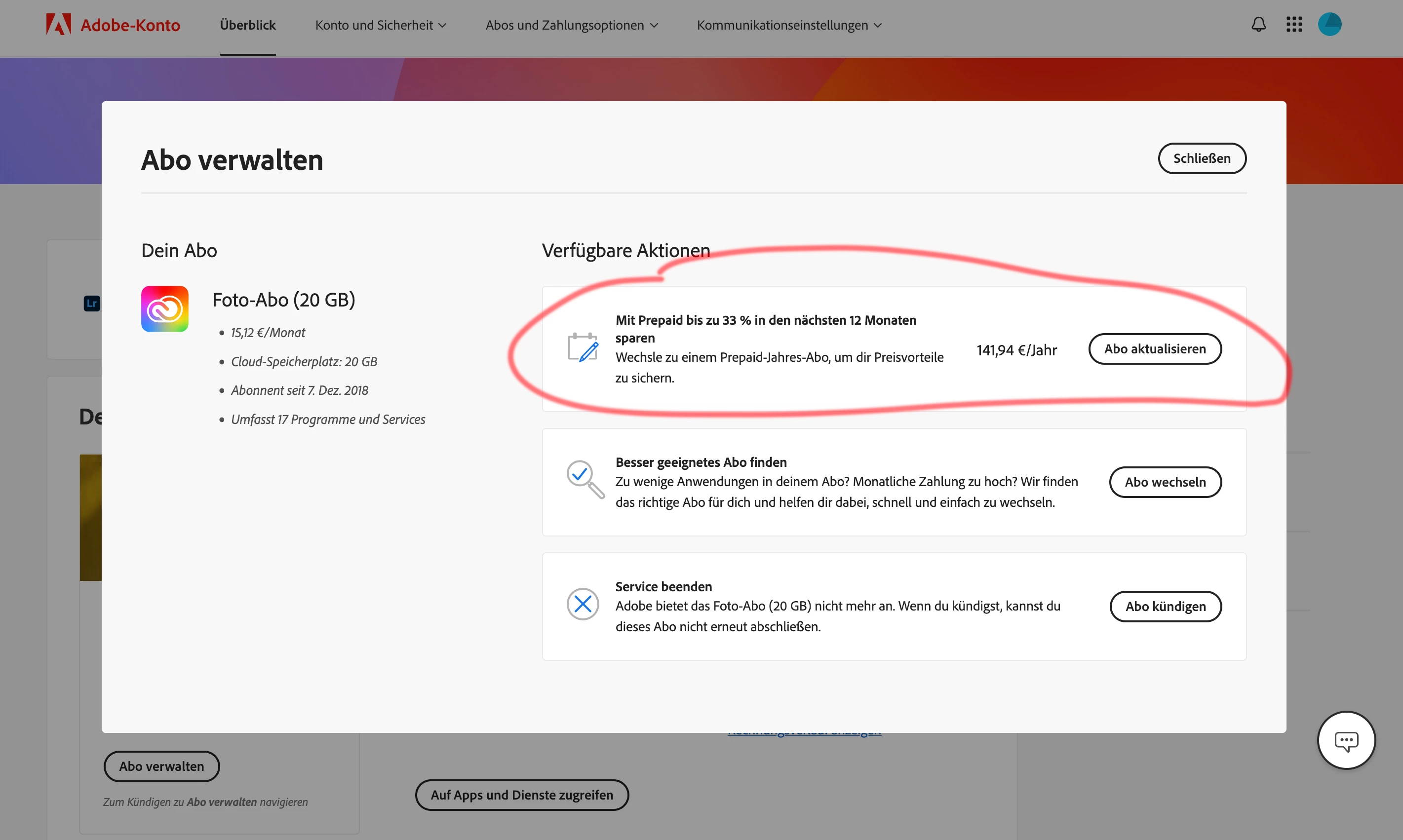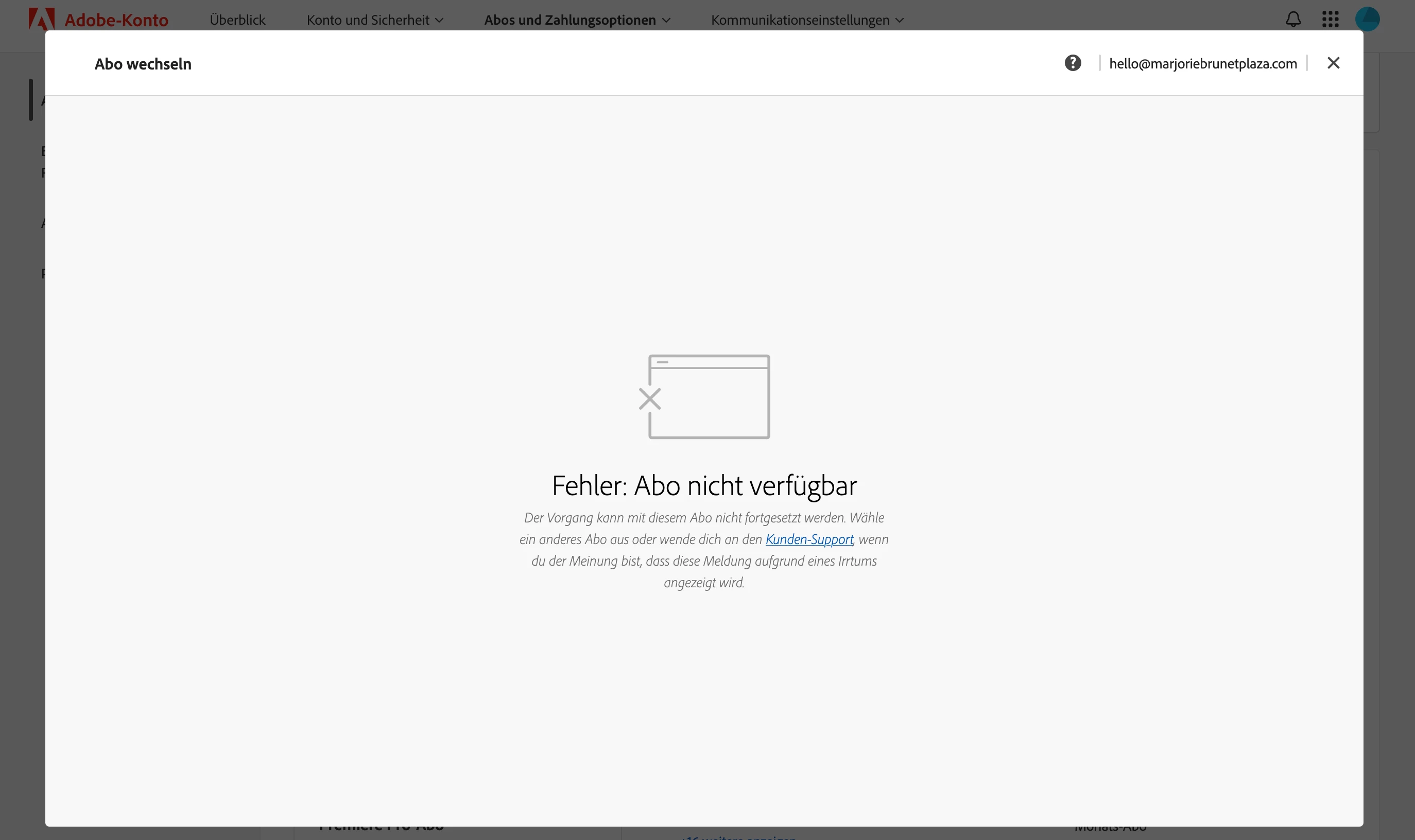 Adobe sent me an update per email to my Creative Cloud Photography plan. They offer to change my subscription to an annual plan to keep the same price. The annual plan was visible, but it did not work (see image screen below). An error showed up.