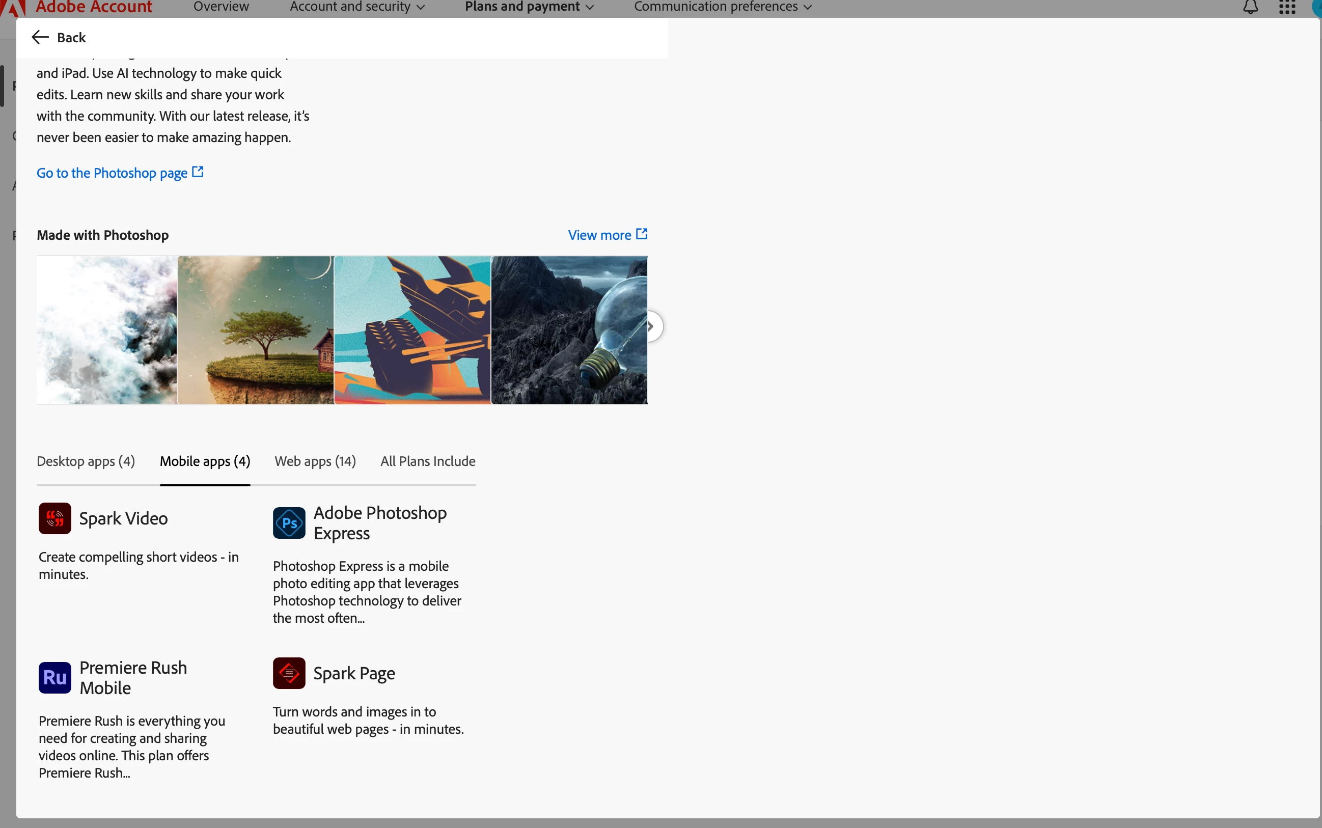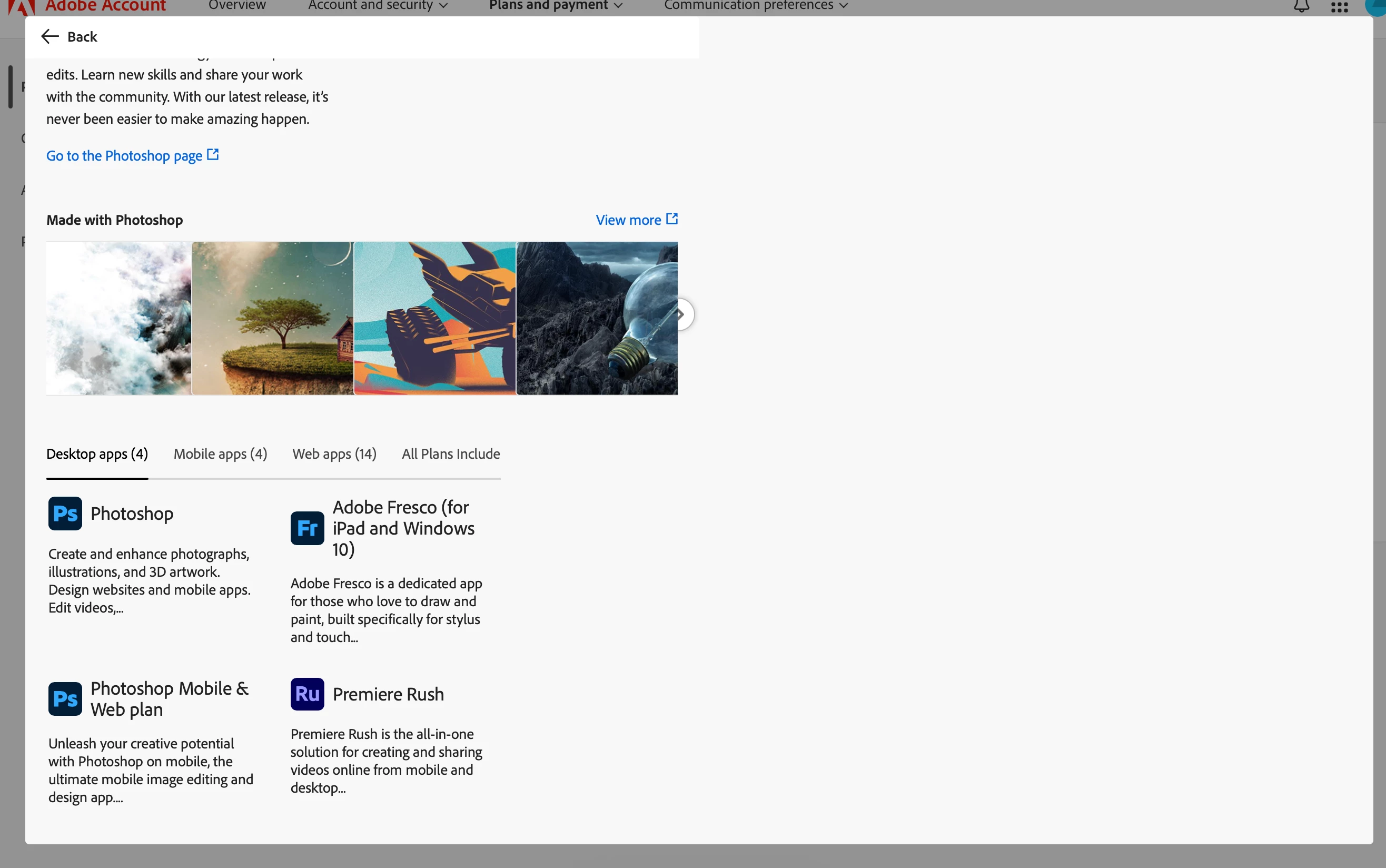 So, you click on 'Learn more about Photshop'. Then you scroll down and reveal what desktop apps are included.