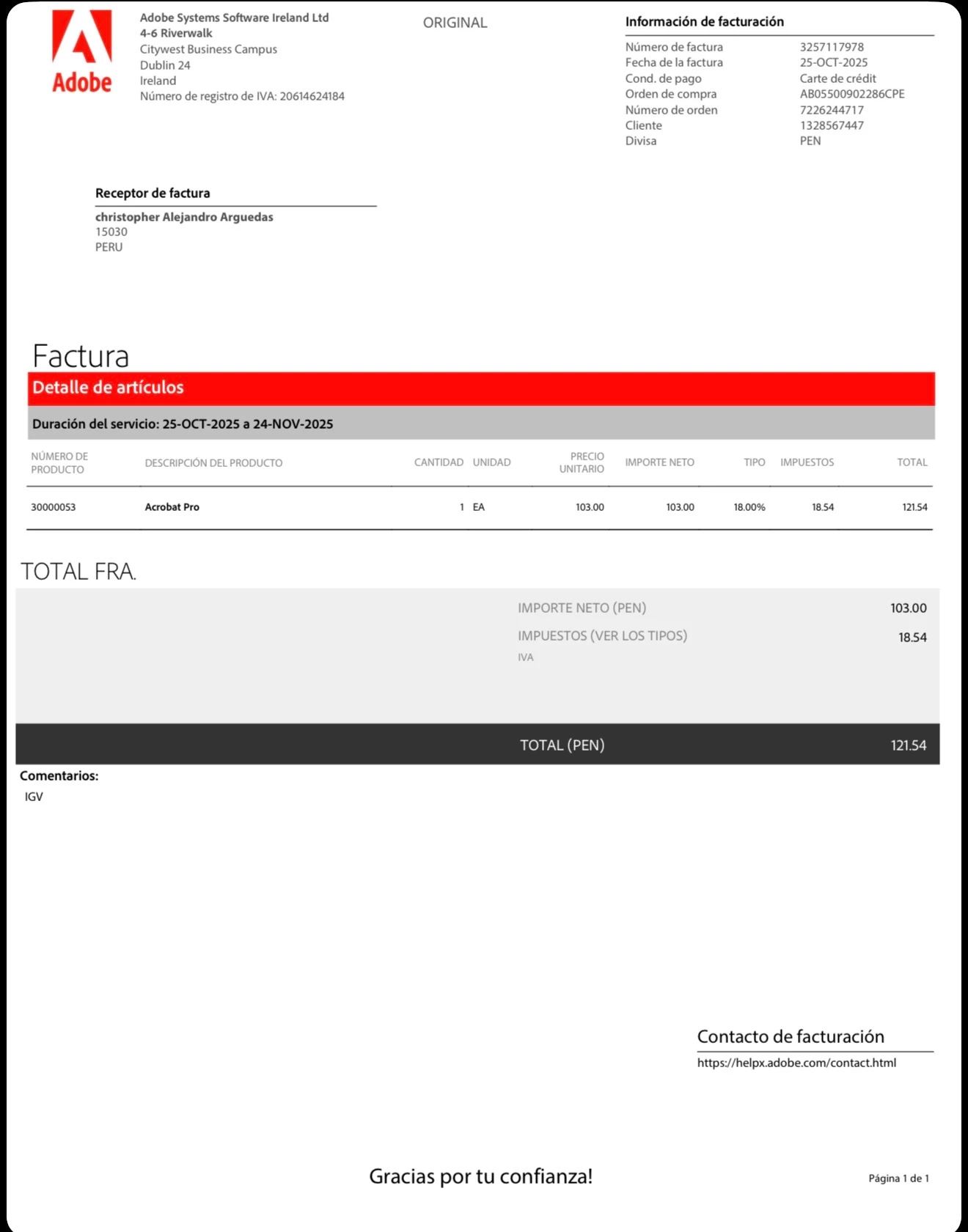 El día 17 de septiembre del 2025 me suscribí a la prueba gratuita de adobe. Sin embargo como visualicé que había un cobro posterior al periodo de prueba. Ese mismo día me desuscribi para evitar cobro. Me llegó el correo de confirmación de la desuscripcion sin embargo el 25 de septiembre me realizan un cobro de S/ 121.54 (soles) y el 25 octubre es decir hoy mismo que me entero de todo esto me hicieron otro cobro de S/ 121.54 (soles).