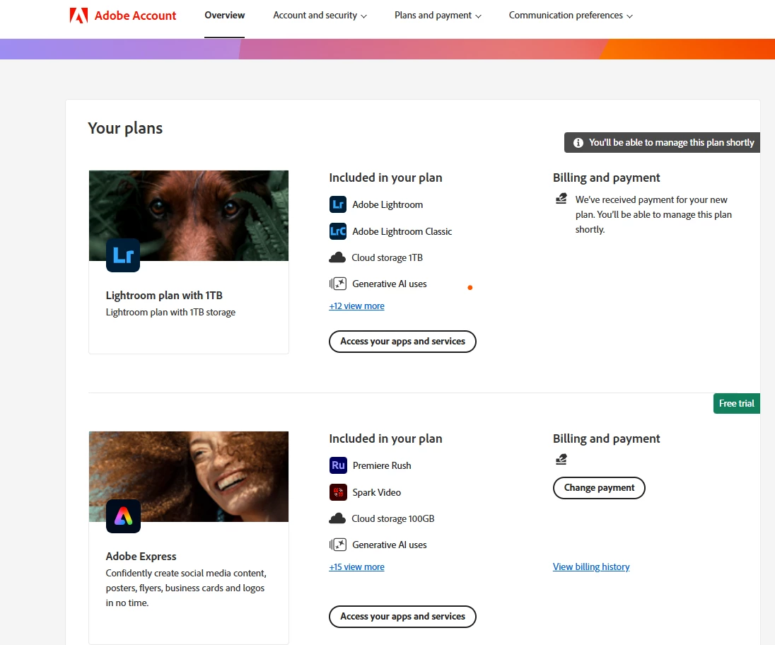 I would like to cancel my Adobe Lightroom plan because I am no longer using it. However, it shows the message, “You will be able to manage this plan shortly.”
