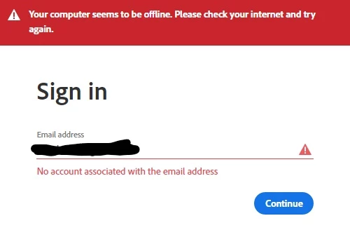 I opened Creative Cloud and it had automatically signed me out. Every time I try to sign in, this shows up. My wifi is fine, as I've loaded this page on the same computer, and I know this is the correct email because I was sent a verification code.