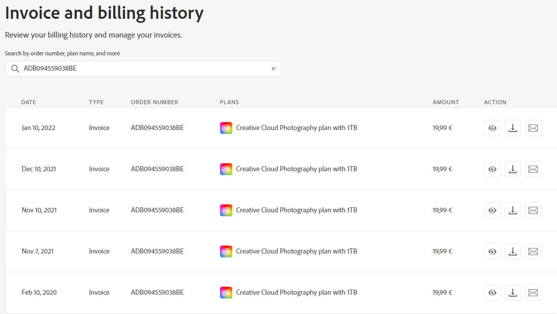 I have a subscription to Creative Cloud Photography Plan with 1TB and I am being billed for that monthly on the 10th of each month. (order number: ADB094559038BE)