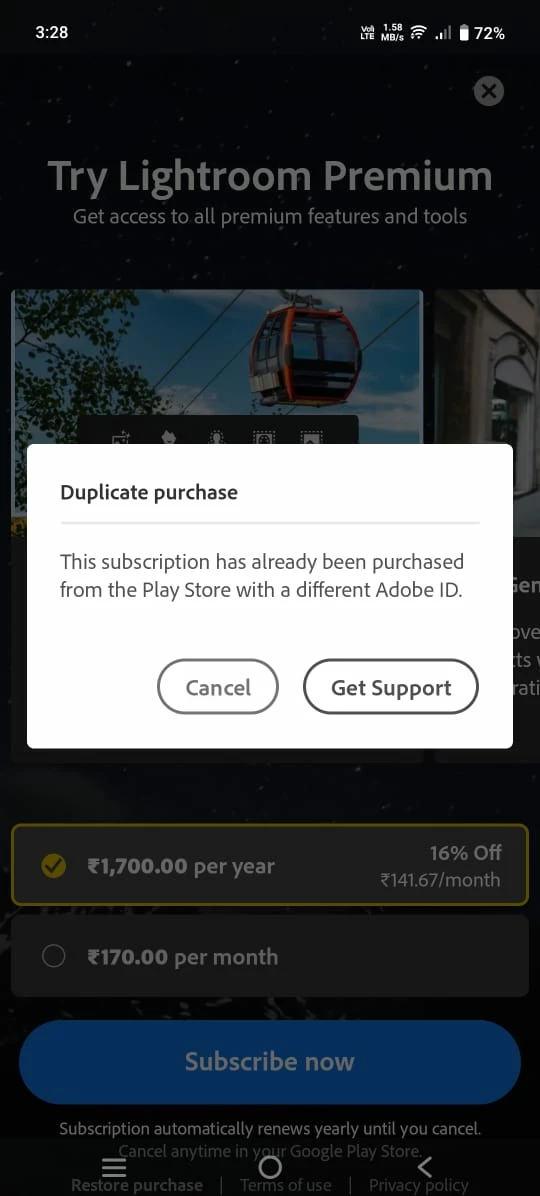 Hello I have subscription Lightroom ai photo editor from Google play now when I'm logging iny new device it's showing duplicate purchase issue