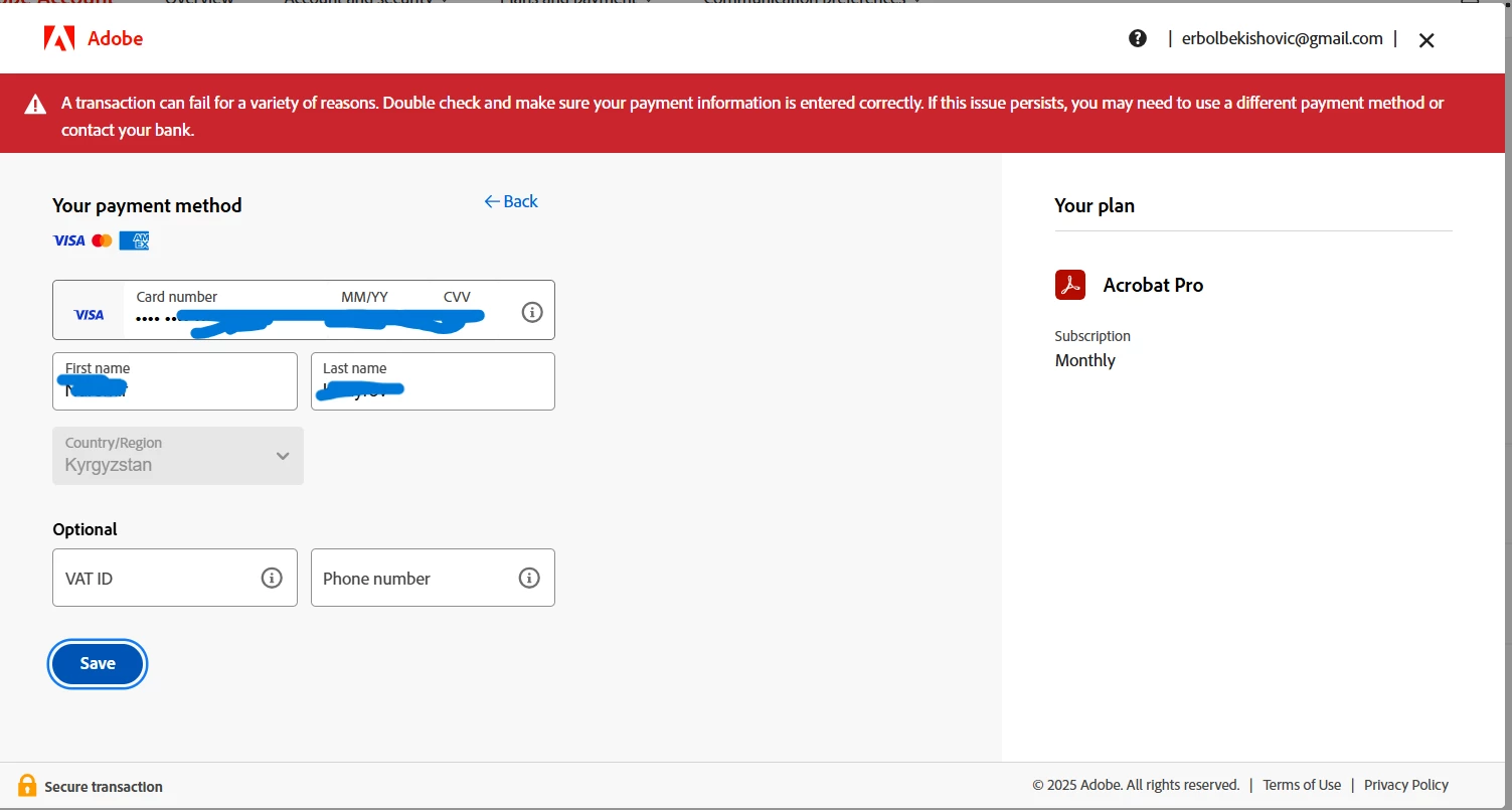 "A transaction can fail for a variety of reasons. Double check and make sure your payment information is entered correctly. If this issue persists, you may need to use a different payment method or contact your bank."