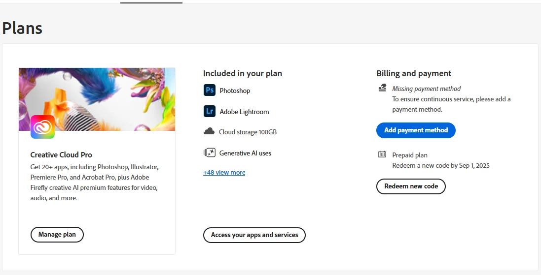 When I checked my plan on the Adobe website, it says I have a Prepaid Plan and shows: "Redeem a new code by Sep 1, 2025."