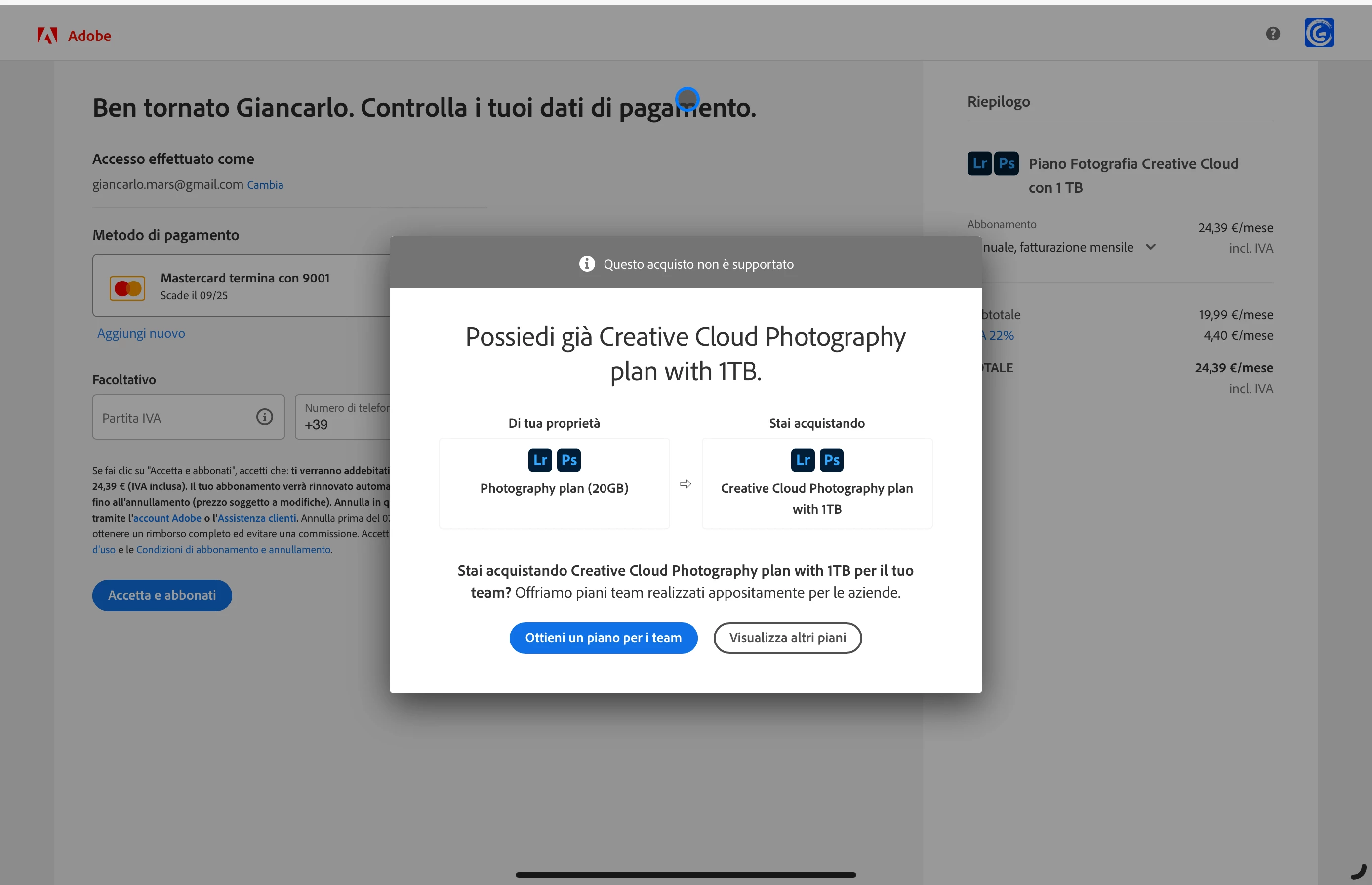 I'm trying to upgrade my photography plan from 20GB to 1TB but, when I proceed to pay, a pop-up window tells me I already own the upgraded plan, which I obviously don't, and gives me only the option to subscribe to a teams plan.