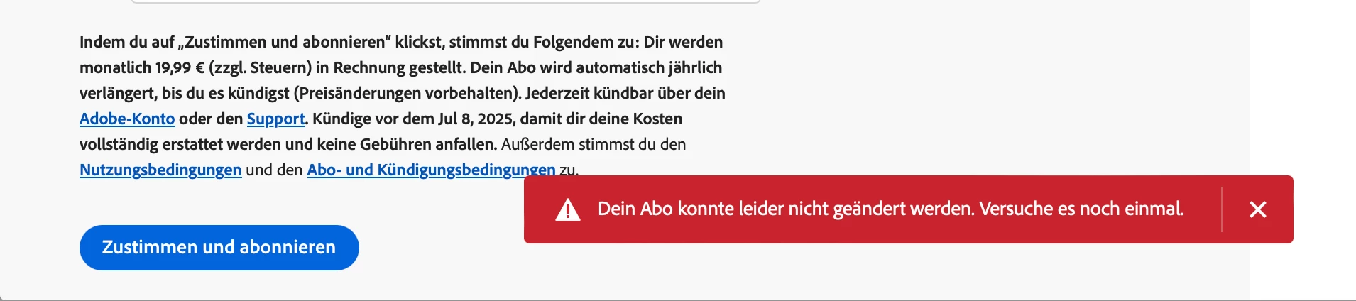 ich möchte mein Abo ändern und stoße auf ein nerviges Problem. Aktuell bin ich Besitzer des Creative Cloud All Apps Abonnements und möchte auf das Photoshop-Abo wechseln. Unter Konto verwalten > Abos > Abo verwalten bin ich die simplen Schritte zum Wechseln meines Plans durchgegangen. Im letzten Schritt benötigt Adobe meine Zustimmen, leider erhalte ich hier jedesmal die Fehlermeldung: