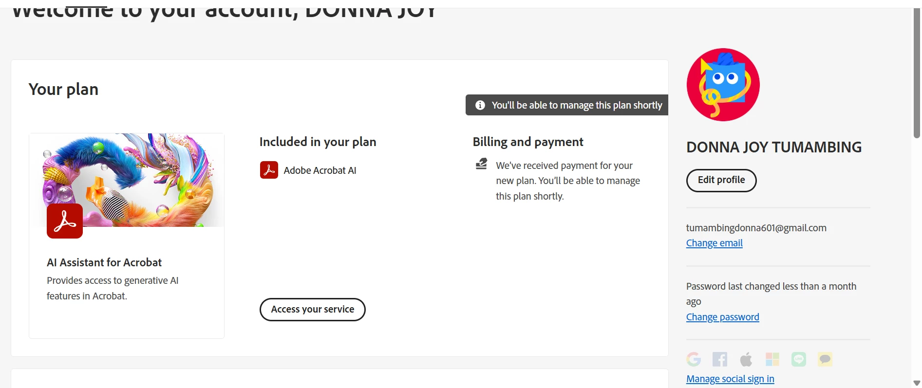 Ddonna_joy_9639ParticipantForum|Forum|5 months agoAugust 19, 2025QuestionHow do I cancel my AI Assistant for Acrobat and get a full refund for the payment?Forum|Forum|5 months agoAugust 19, 20251 reply279 views BillingAccount management