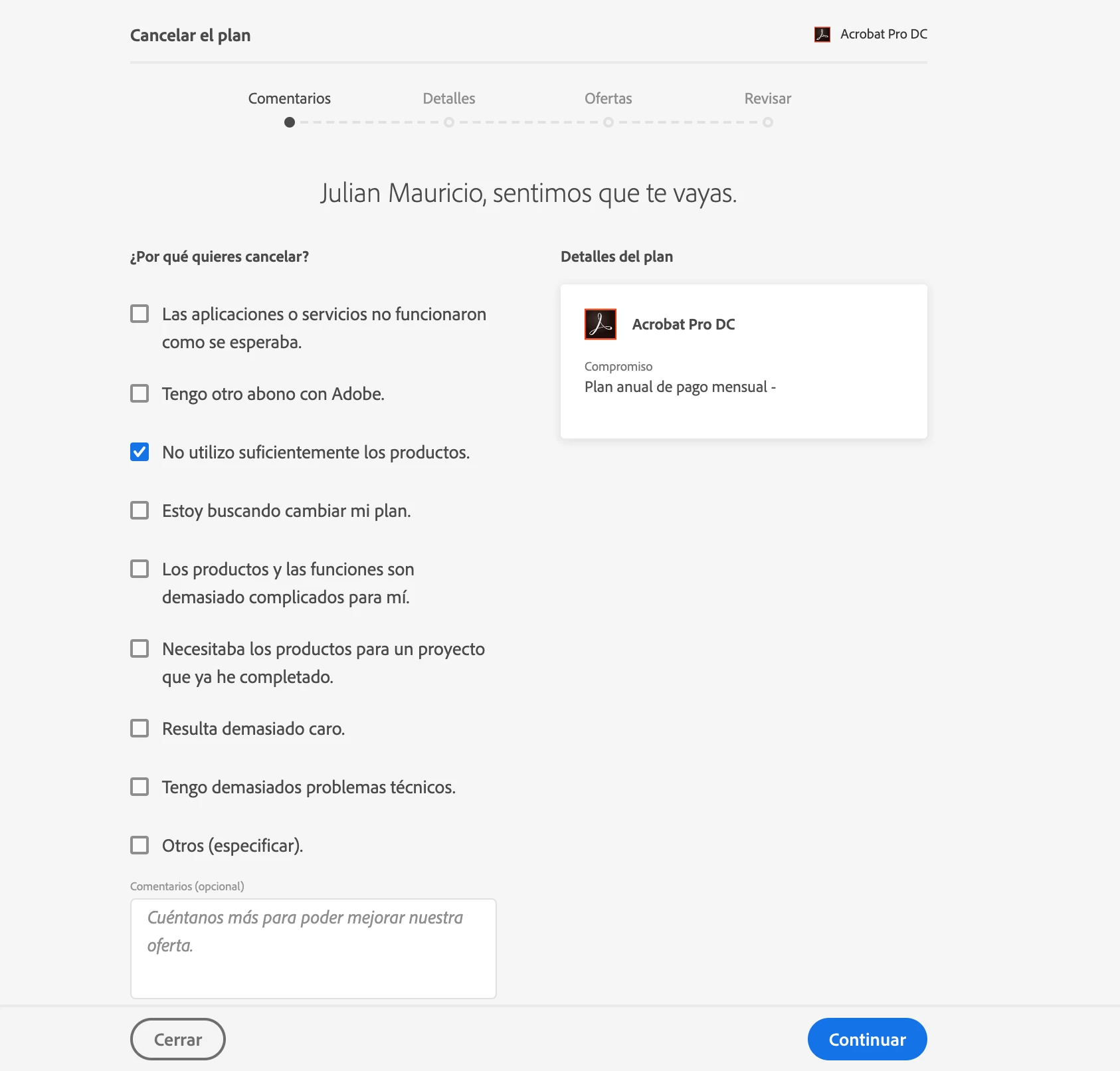 I need cancel my plan, I follow all steps, select the options beacuse that I want cancel my plan, I pick up continue, show that the functions that will be not have if I cancel the plan, I pick up continue and generate error